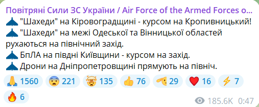 Як повідомляють Повітряні Сили ЗСУ, в результаті бойової роботи вдалося збити 35 із 39 «шахедів» у межах Кіровоградської, Миколаївської, Дніпропетровської, Черкаської, Одеської, Херсонської, Хмельницької, Вінницької, Київської та Житомирської областей.