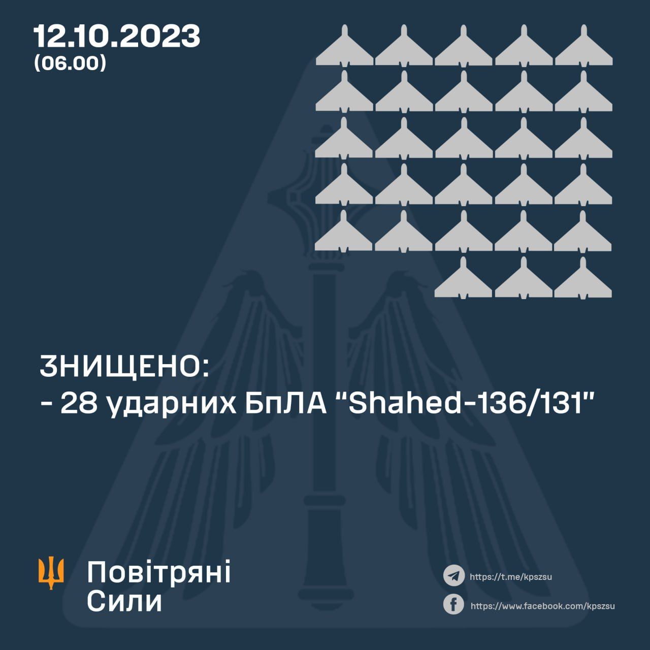 Загалом цієї ночі сили та засоби Повітряних Сил, у взаємодії із ППО Сил оборони України, знищили 28 «Shahed-131/136».