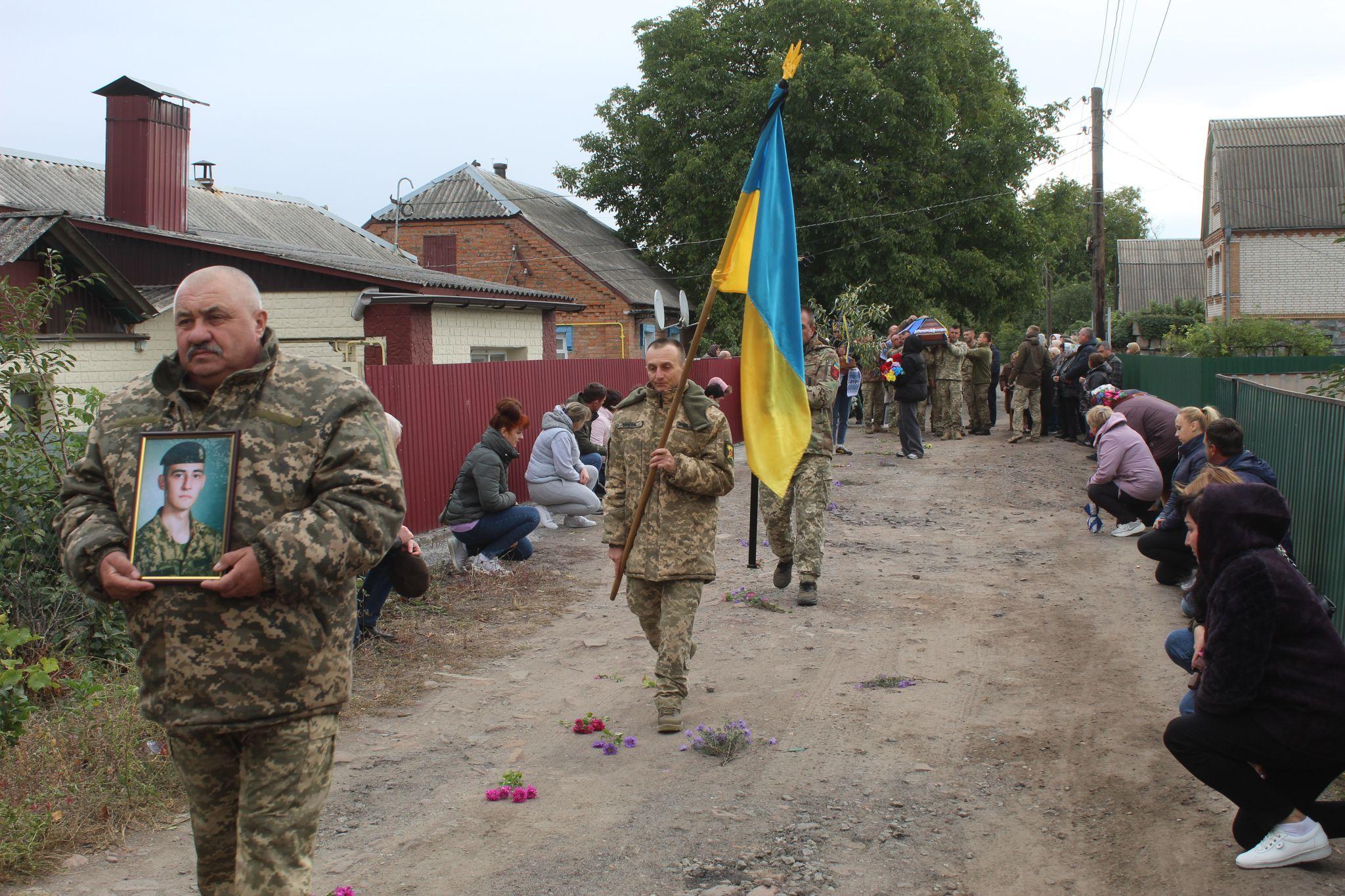 Коли з захисником України попрощалися біля будинку батьків, на вулиці почала формуватися траурна колона. На її початку — портрет Дениса, за ним гілка зелені з жовто-блакитними стрічками, коровай, корзини і оберемки живих квітів. Рушила траурна процесія до храму Святого пророка Іллі.
