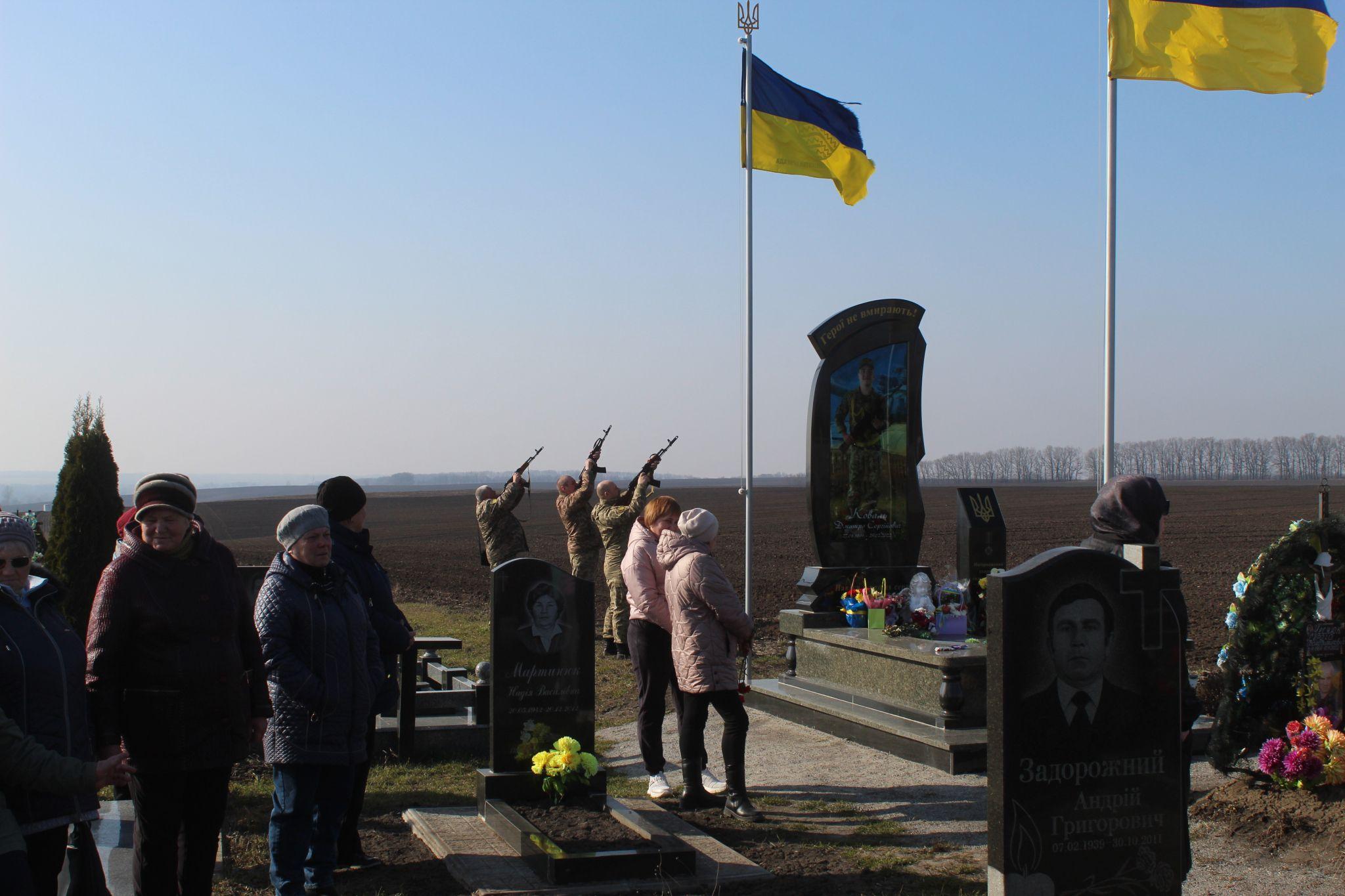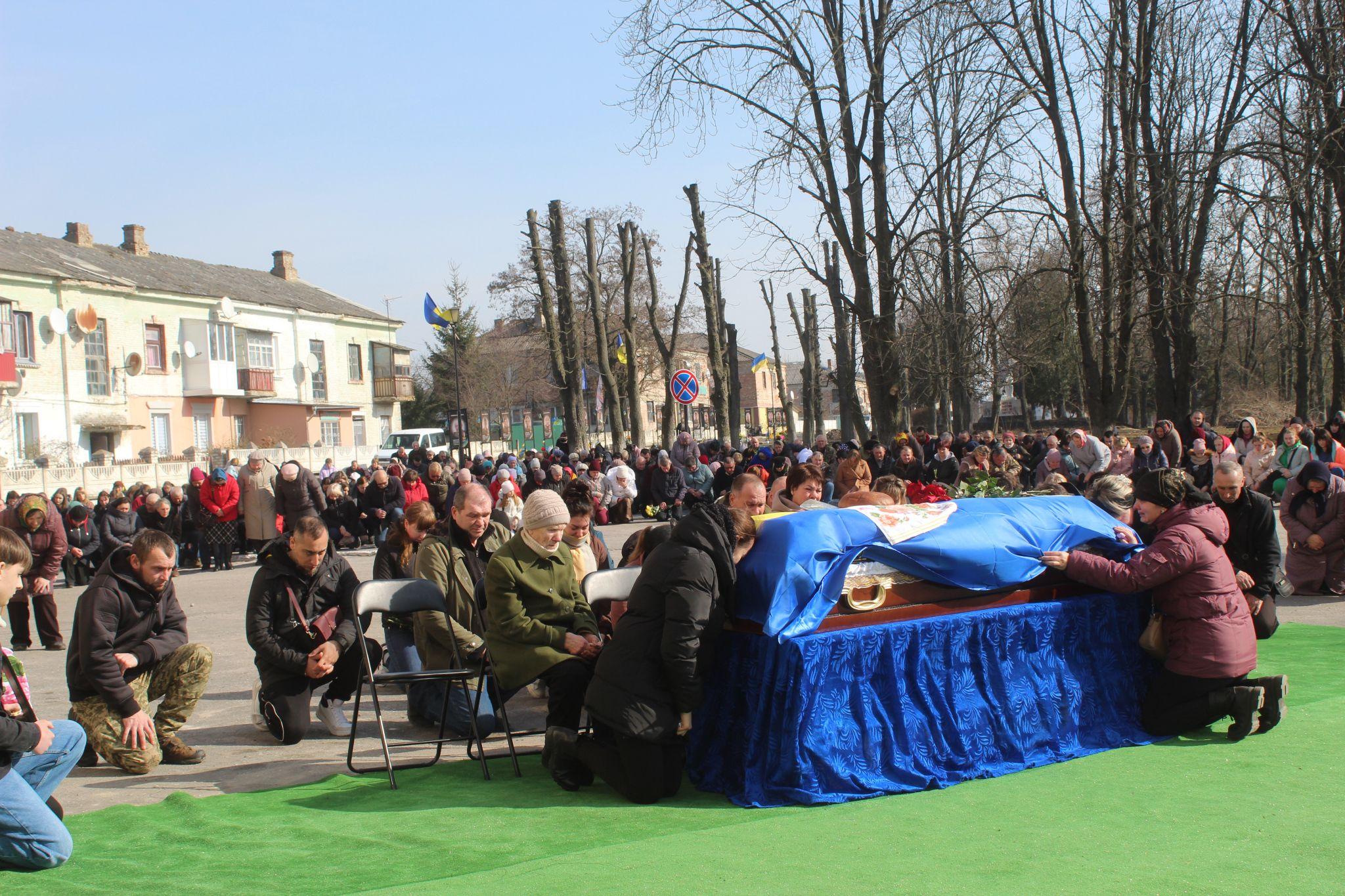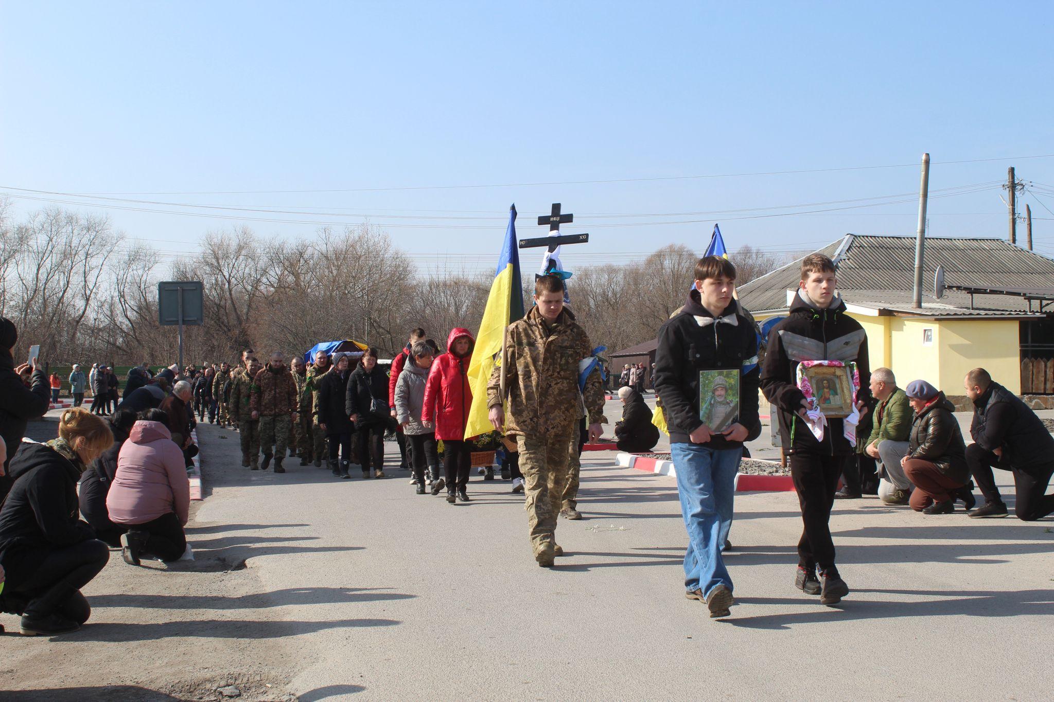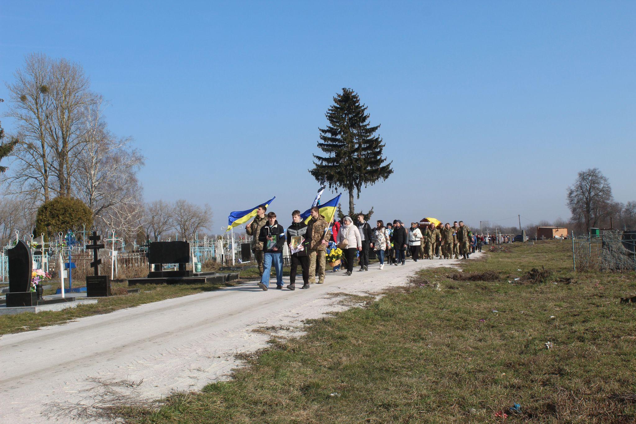 Зустріла громада свого Героя 29 лютого живим коридором від Пляхової до будинку загиблого воїна. Земляки, стоячи на колінах, кидали під траурний кортеж квіти, гілки хвої і вербові котики.