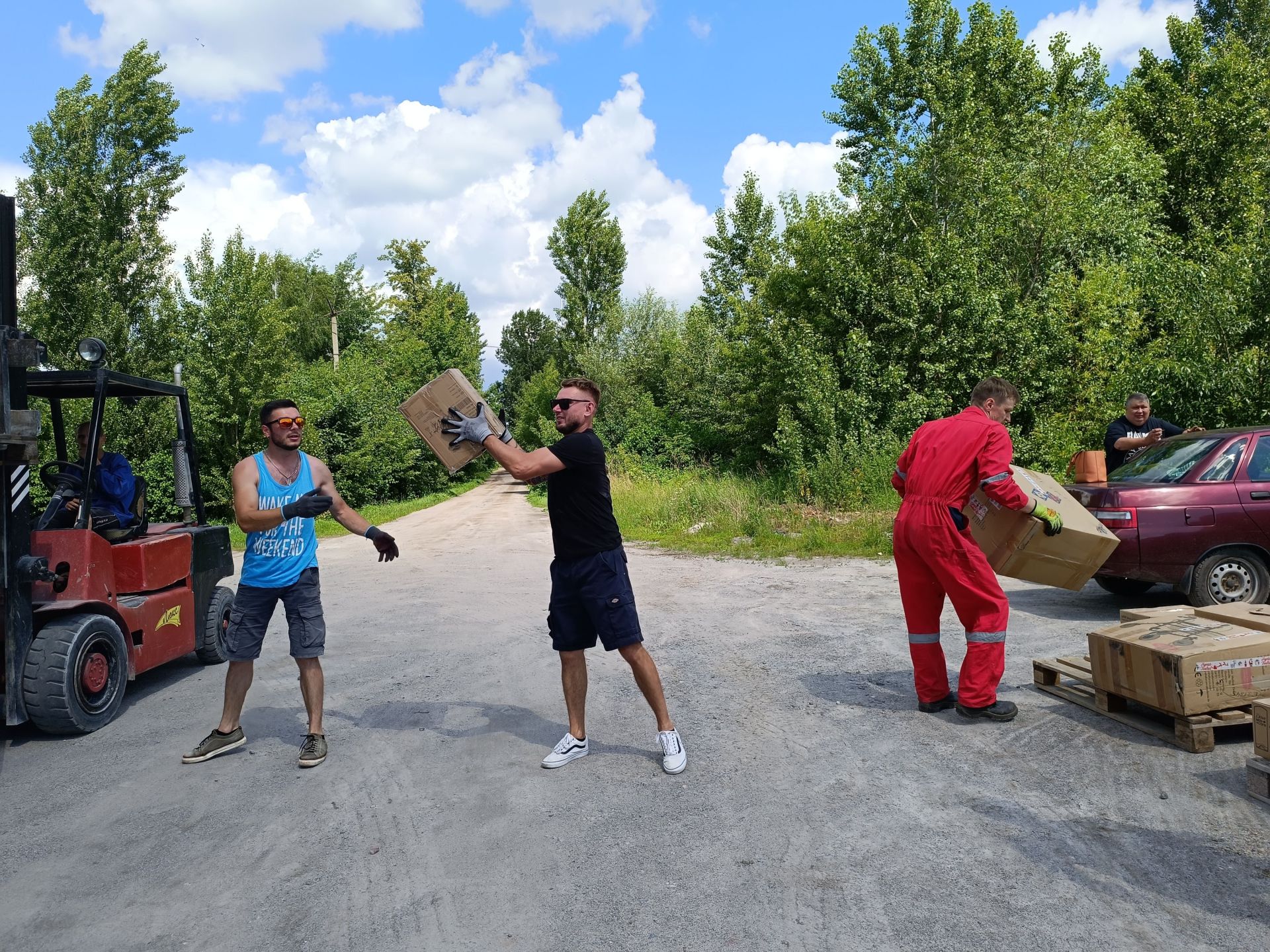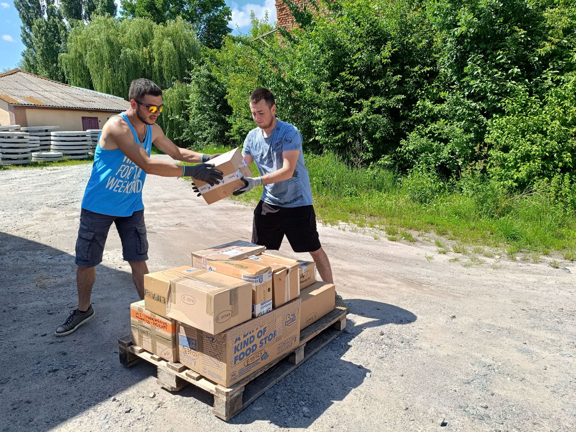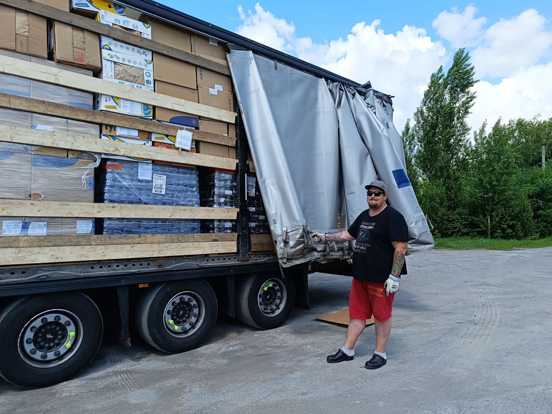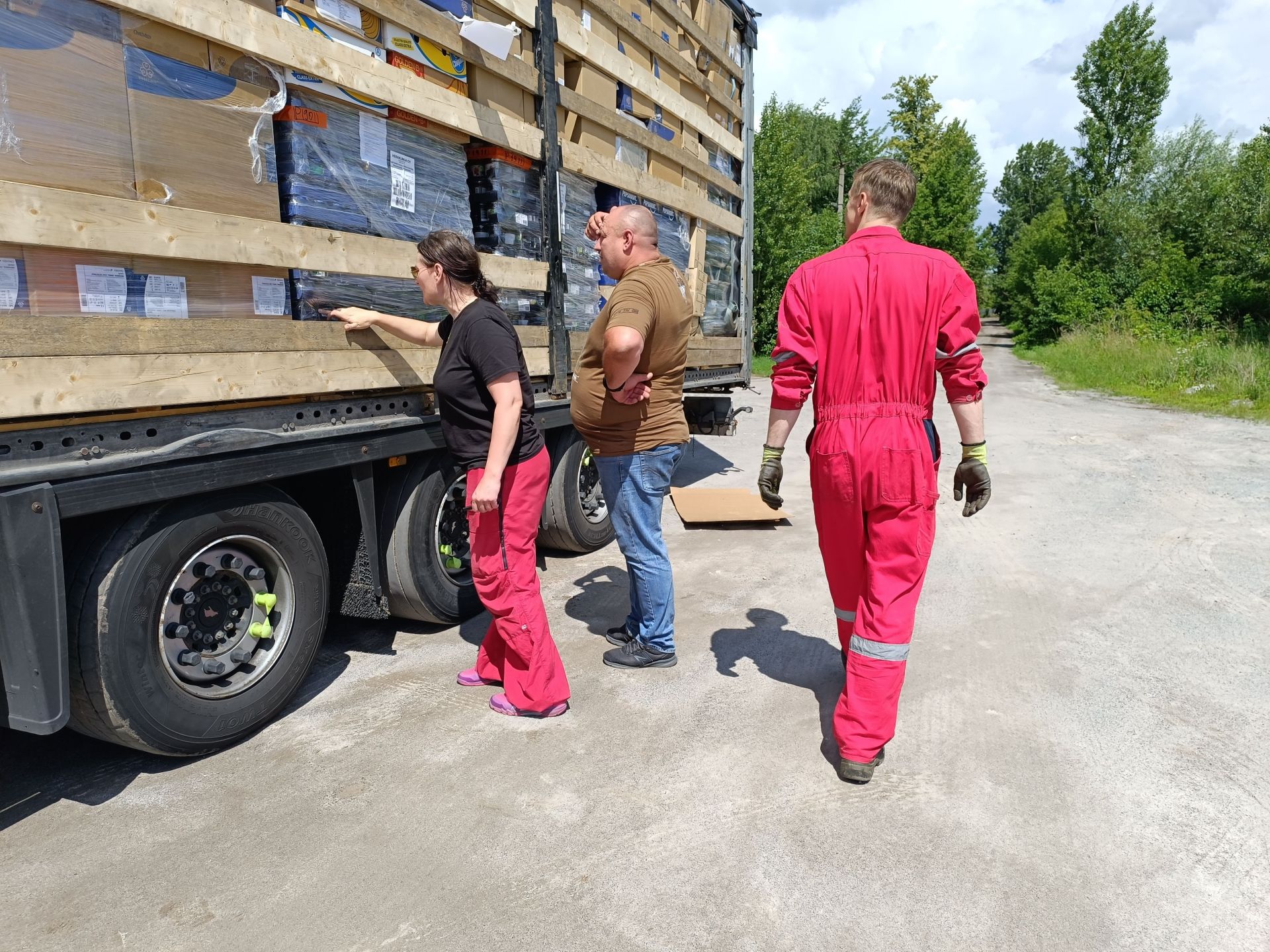 Юкка відкриває тент із написом «Транспорт Хосіке» фінською. Вантажівка заповнена коробками різного розміру. Кожна з них підписана. Волонтери фонду «Бойовий волонтер України» починають розвантажувати фуру. Вони складають коробки на палети.