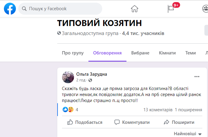 “Скажіть будь ласка, це пряма загроза для Козятина? В області тривоги немає, як повідомляє додаток. А на прб сирена цілий ранок працює!! Люди, страшно”, - написала вранці в одній із місцевих груп у Фейсбук Ольга Зарудна.