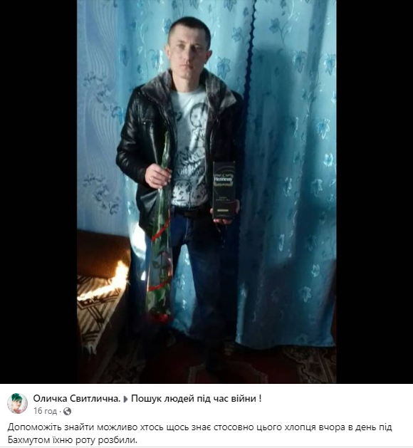 — Допоможіть знайти можливо хтось щось знає стосовно цього хлопця вчора в день під Бахмутом їхню роту розбили. Шевчук Віталій Олександрович 19.01.1984 р. Козятинський р-н с.Непедівка. Будь ласка скажіть якщо хтось щось знає. 61 бригада 101 батальйон