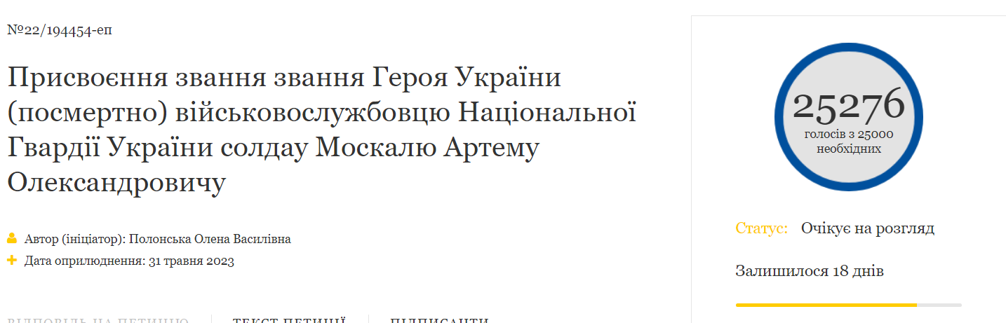 Нагадаємо, у середу, 31 травня на офіційному інтернет-представництві Президента України опублікували електронну петицію з проханням присвоїти звання звання Героя України (посмертно) військовослужбовцю Національної Гвардії України солдату Москалю Артему Олександровичу