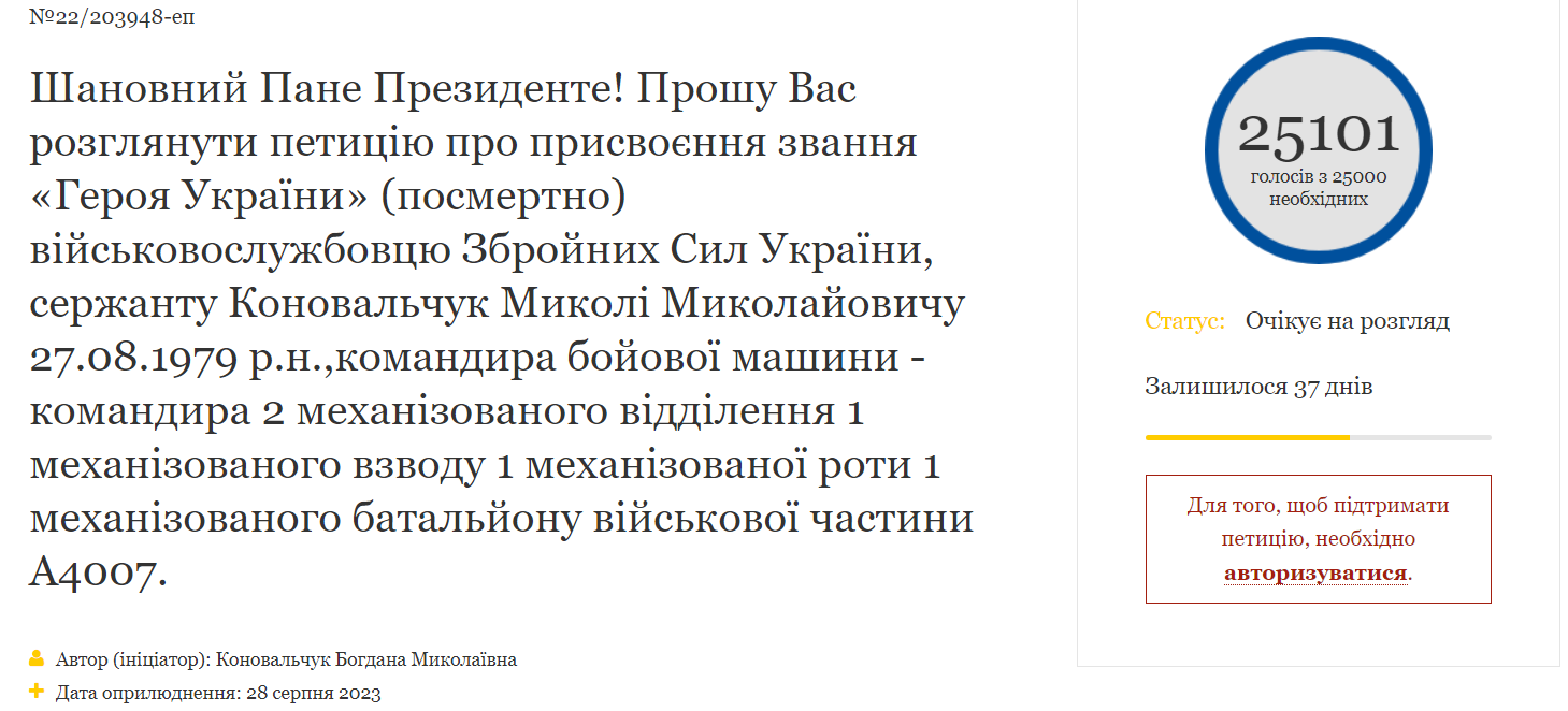 - Наприкінці серпня дочка воїна подала петицію до Президента, де просила присвоїти звання «Героя України» (посмертно) її полеглому батькові.