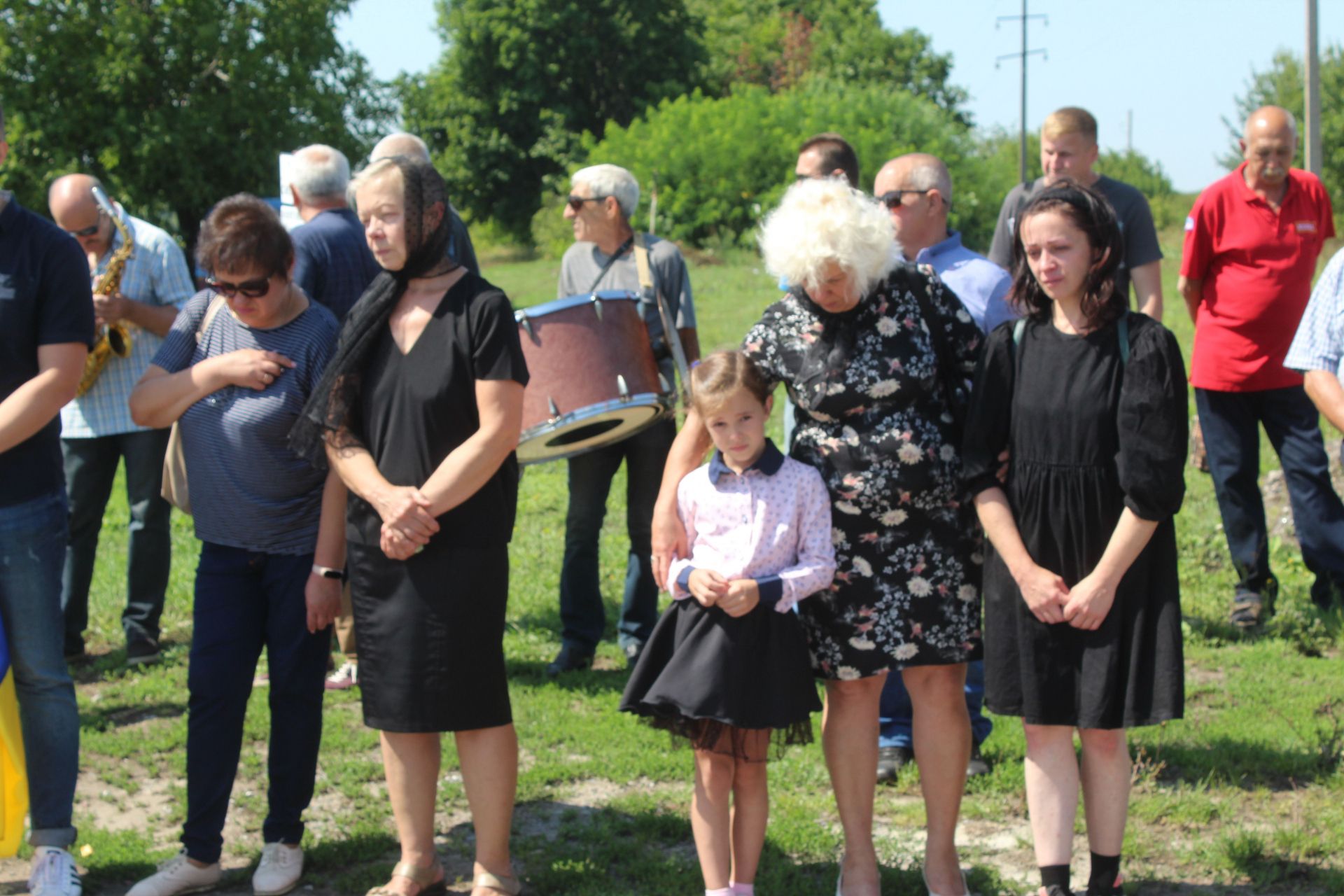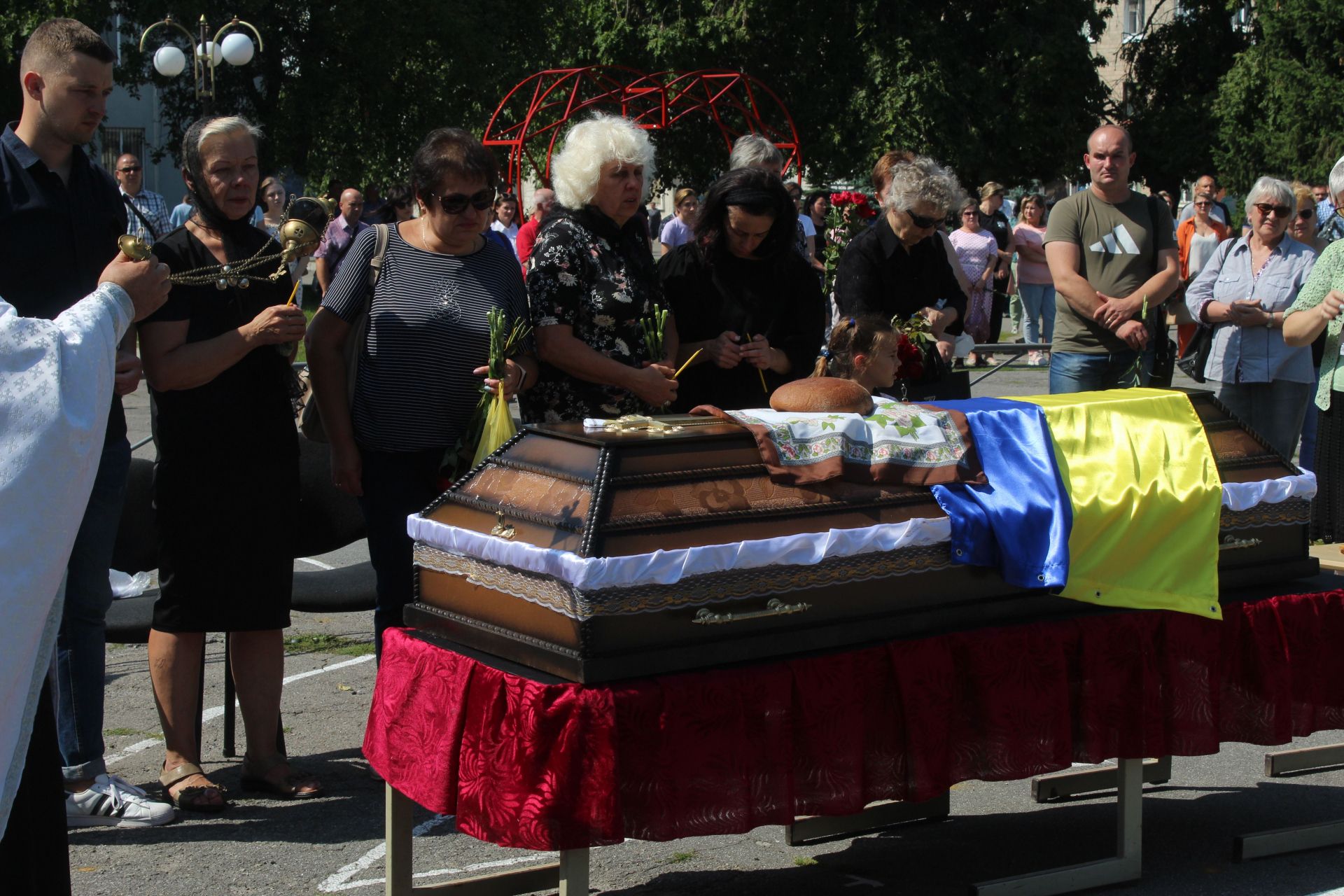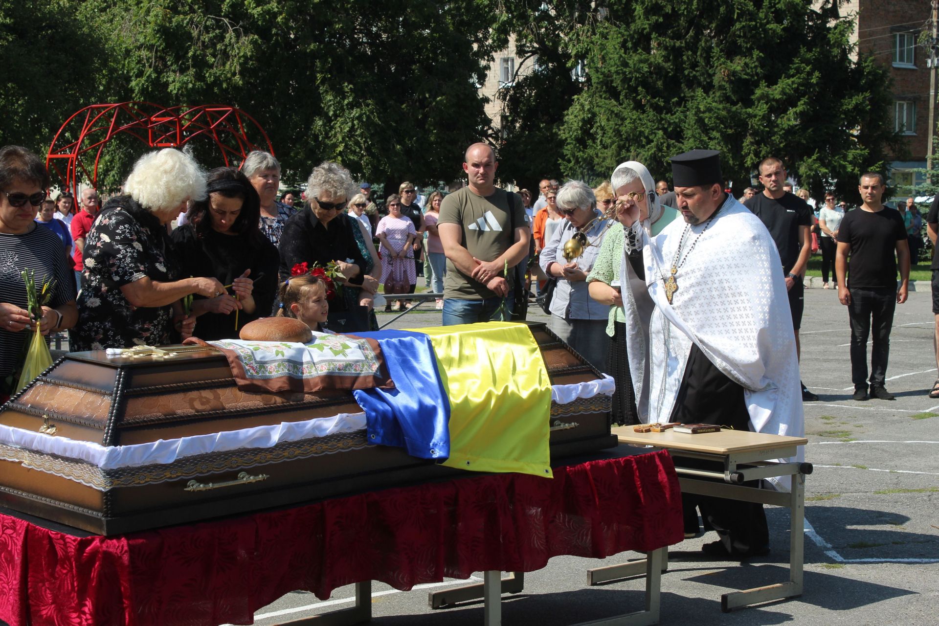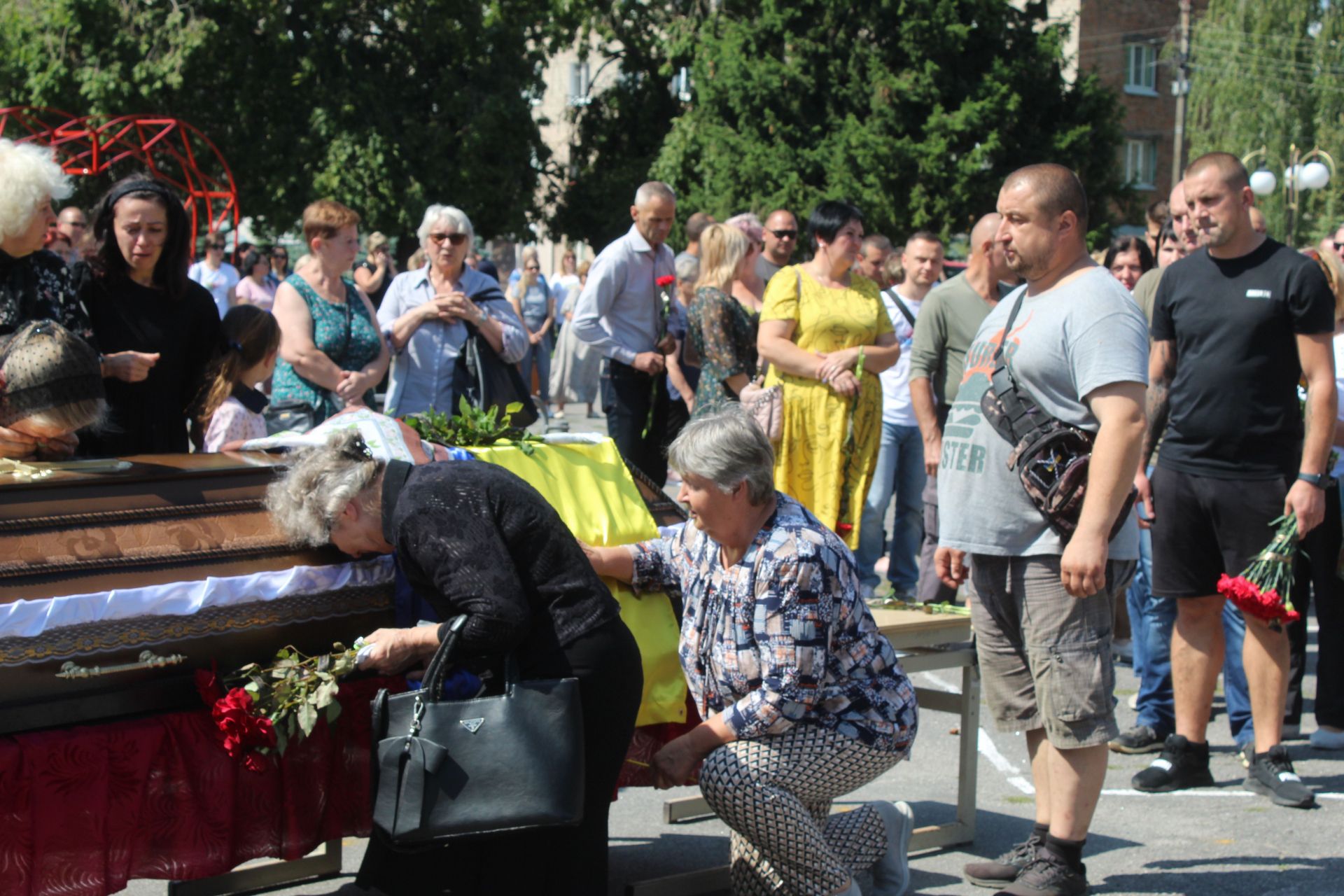 Після виступу очільниці міста з захисником України стала прощатися громада. Без болю в душі не можна було дивитися на дружину воїна Олену. Вона, виплакавши всі сльози за коханим чоловіком, раз пораз підходила до труни батька її доньок і обнімала руками закриту труну.