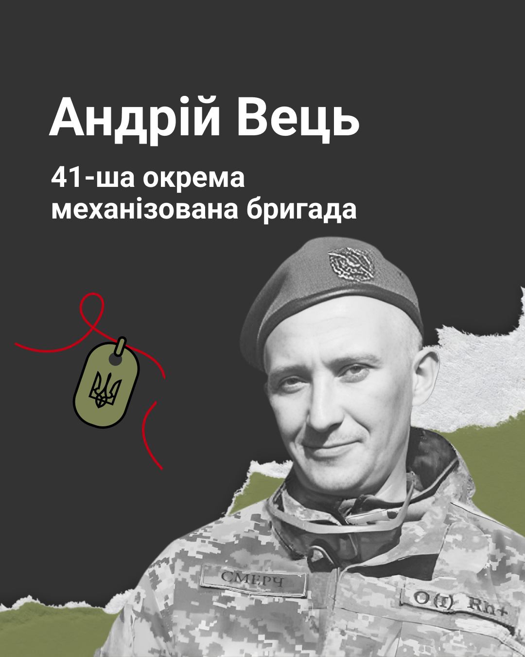 - Молодший сержант Андрій Вець на псевдо «Смерч» загинув 2 квітня 2024 року в ДТП під час передислокації підрозділу на Харківщині. Йому було 39 років.