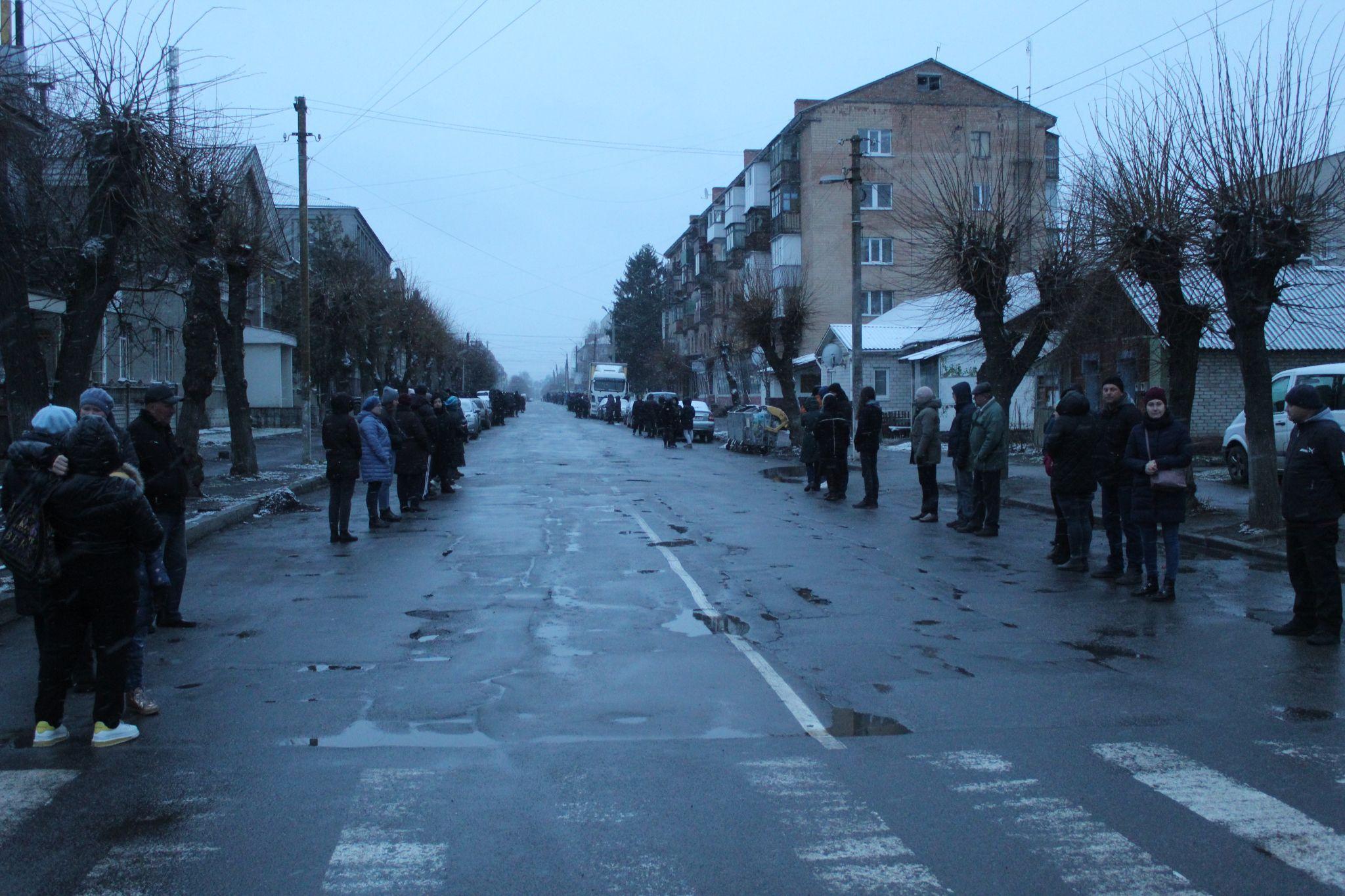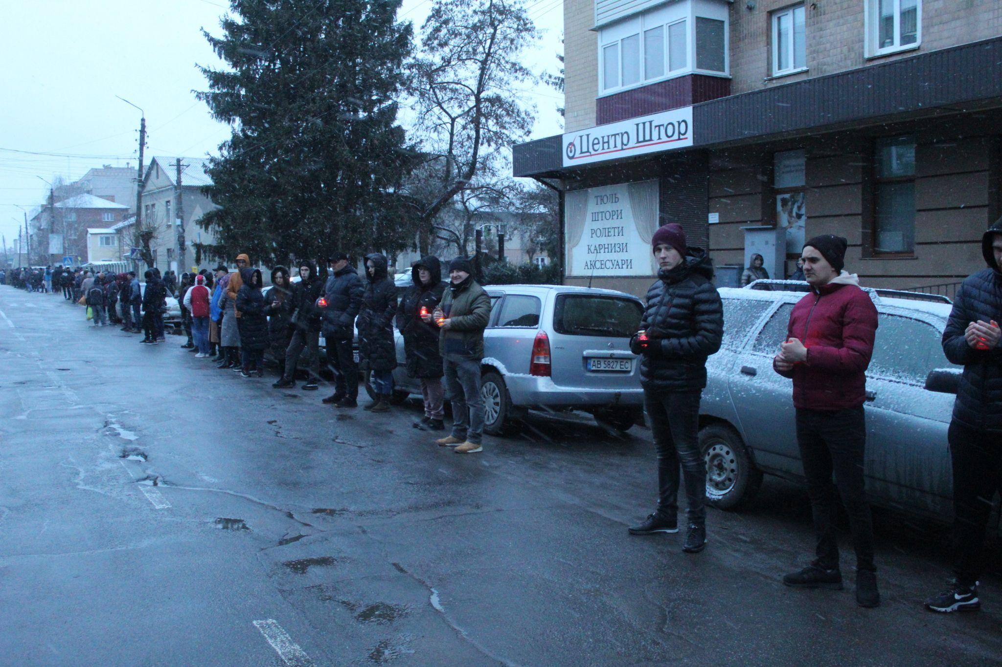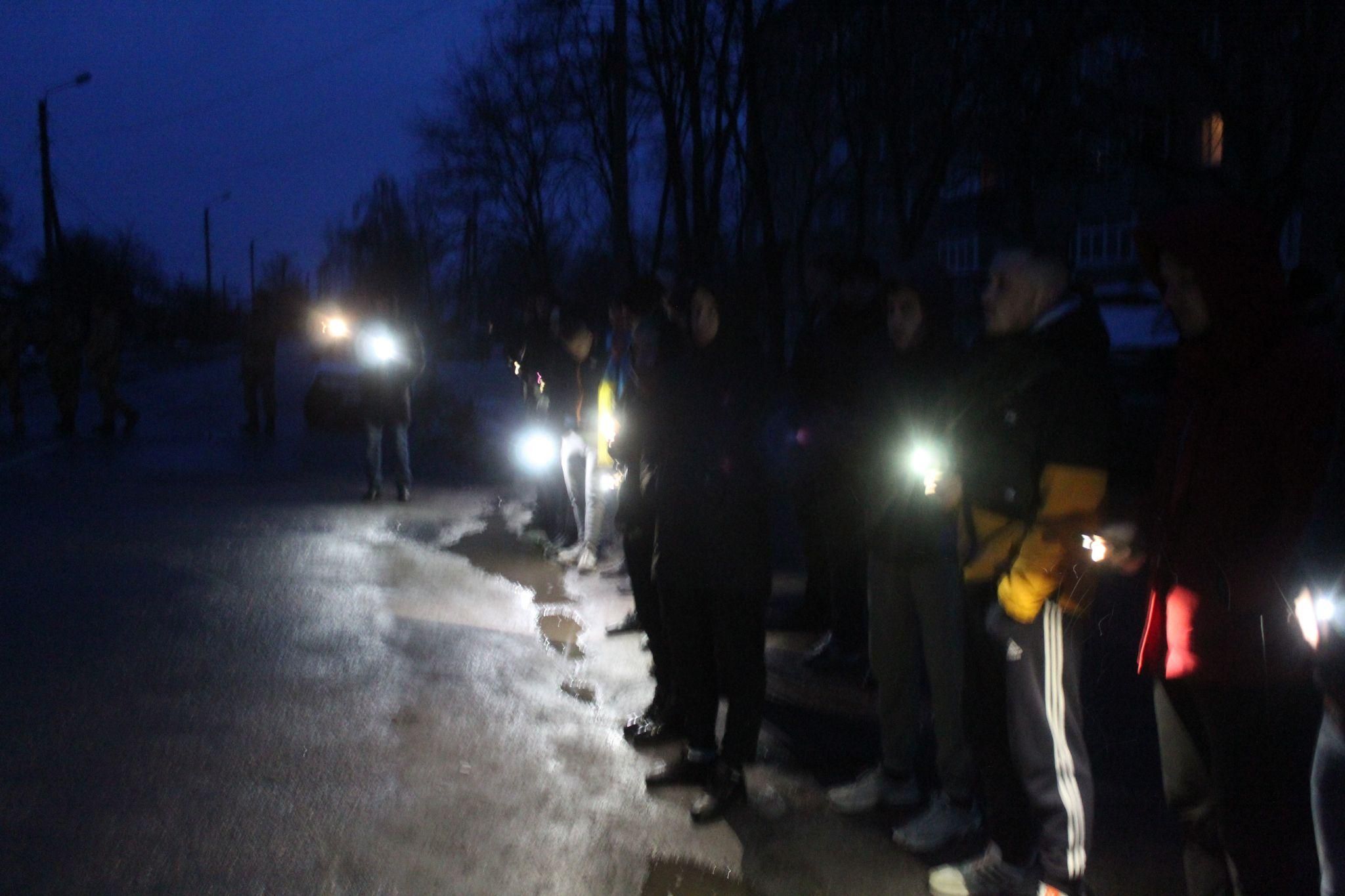 Коли надворі майже смеркло, на дорозі з’явилися мигалки автівок поліцейських. Містяни, які стояли по обидві сторони вулиці запалили свічки, ліхтарики телефонів та стали на коліна.