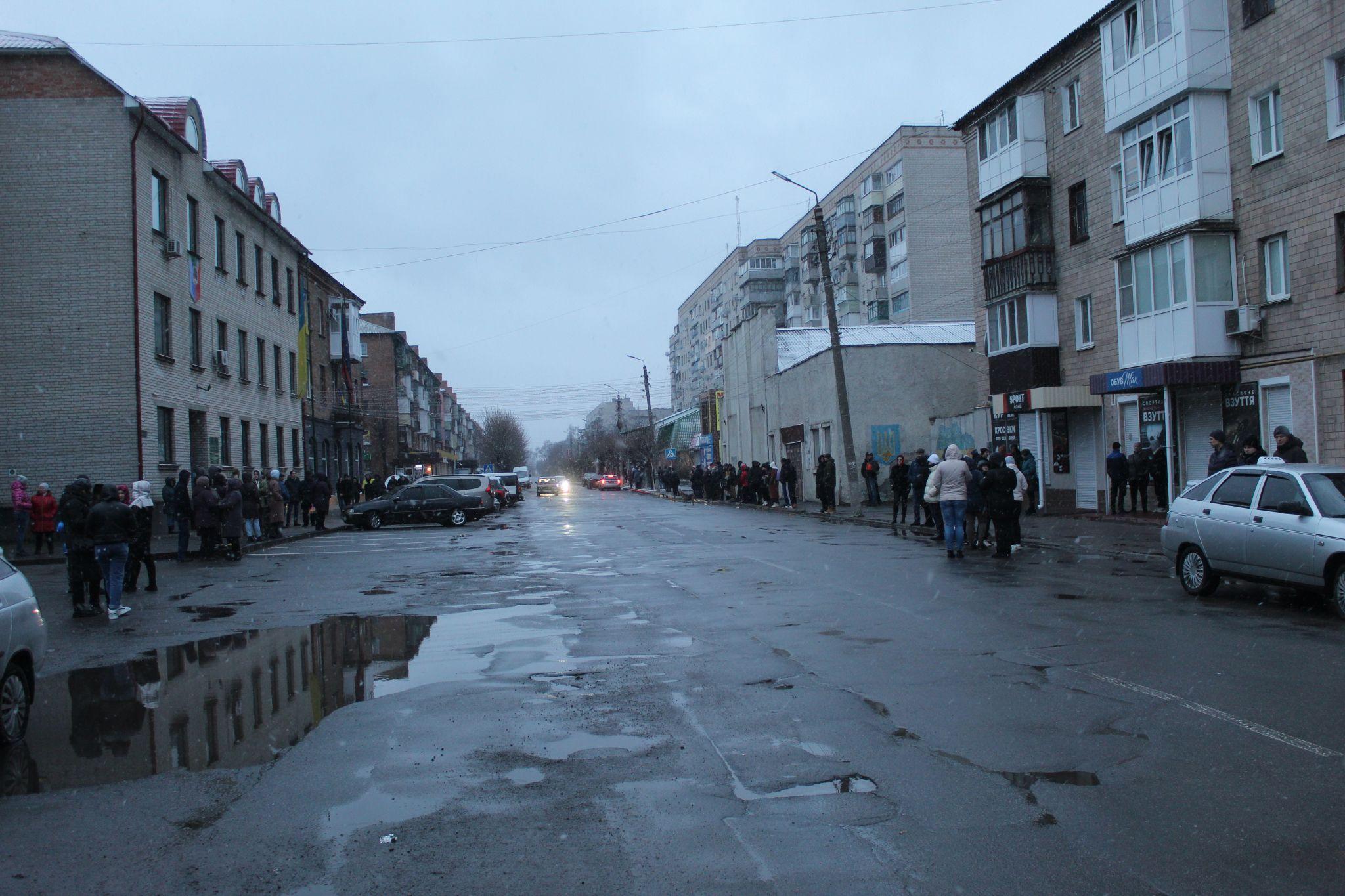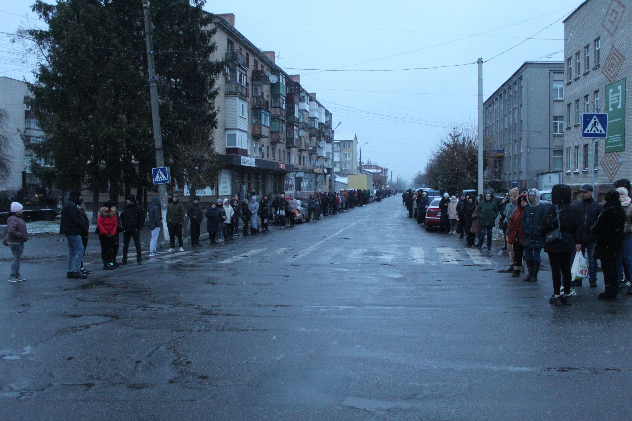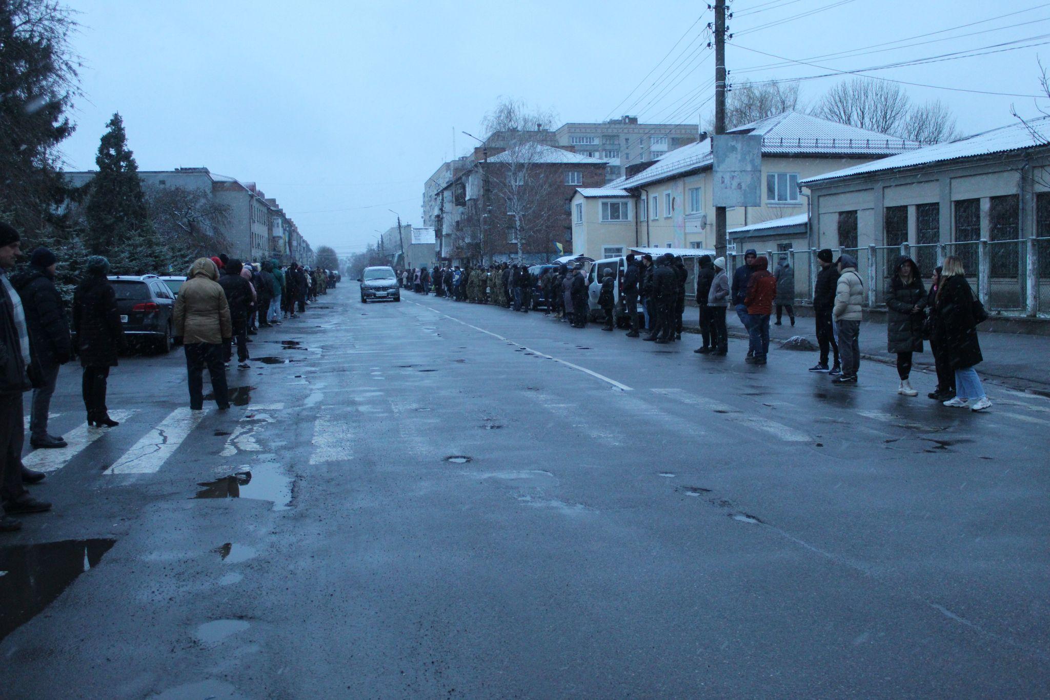 Коли надворі майже смеркло, на дорозі з’явилися мигалки автівок поліцейських. Містяни, які стояли по обидві сторони вулиці запалили свічки, ліхтарики телефонів та стали на коліна.