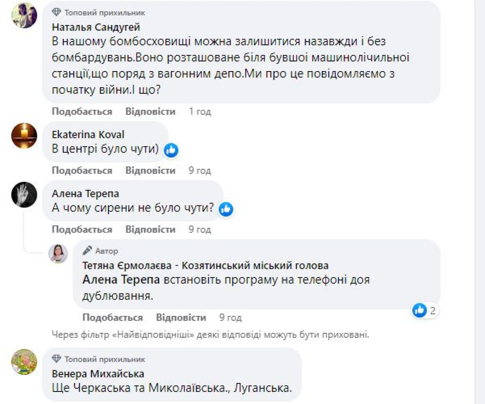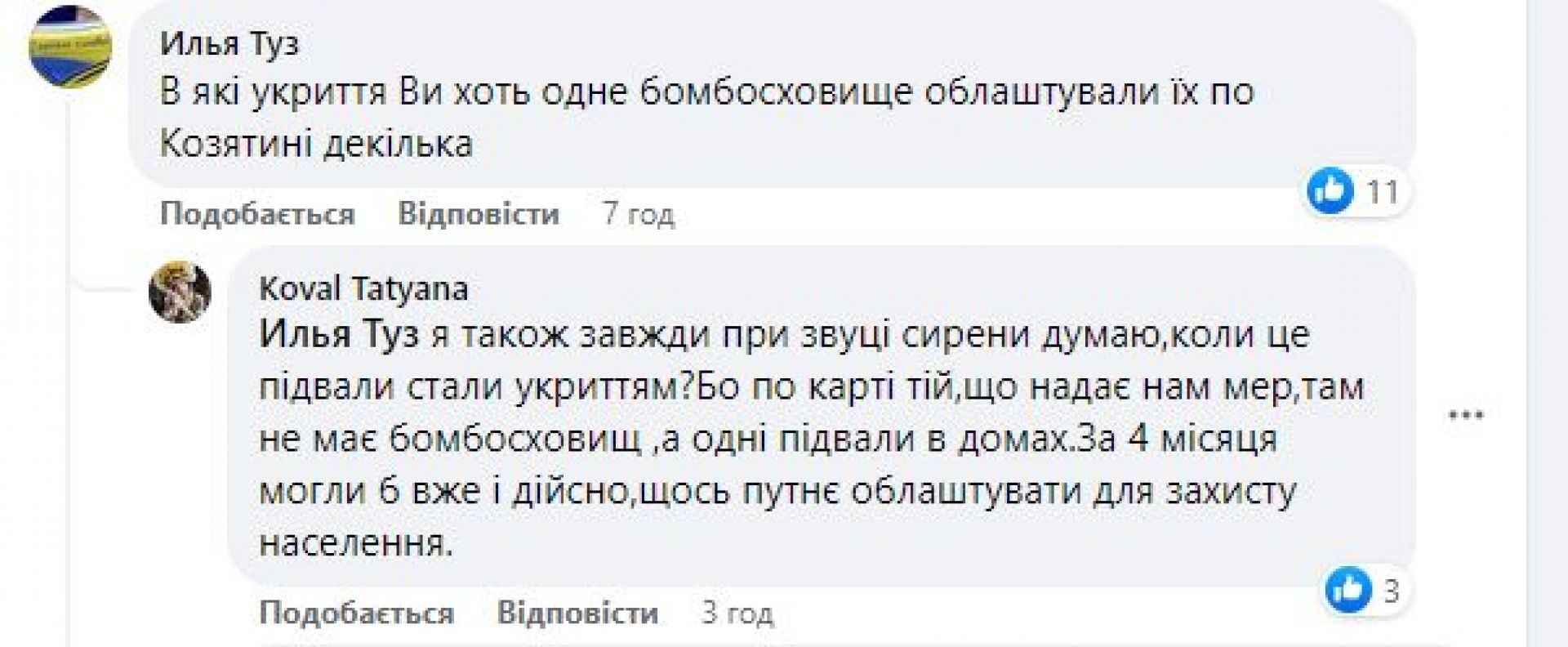 Цей допис викликав у козятинчан чимало обговорень. Зокрема, мешканці Козятина почали писати, що в місті не має належно облаштованих та безпечних укриттів, бомбосховищ. Хіба, що підвали у будинках