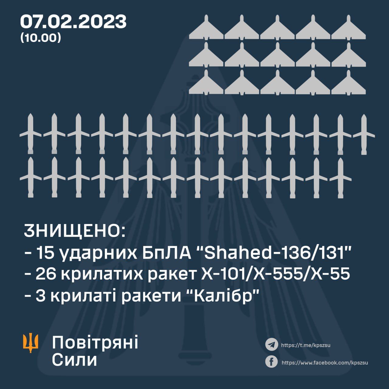 - На початку доби 7 лютого 2024 року противник здійснив кілька ударів по території України, використовуючи різні засоби повітряного нападу – ударні БпЛА, крилаті, балістичні та зенітні керовані ракети.