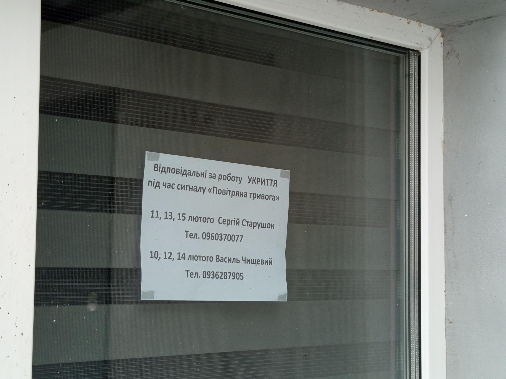 Номери телефонів там тепер справді є — у п’ятницю, 13 лютого, перед тим, як готувати цю публікацію, наші журналісти побачили на вікнах цокольного поверху будівлі Центру дитячої та юнацької творчості, поруч із входом до укриття роздруківки з контактними телефонами осіб, що відповідають за роботу сховища під час повітряної тривоги з 10 по 15 лютого.