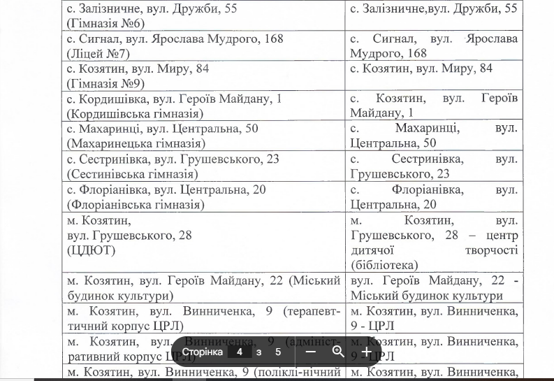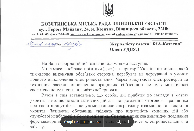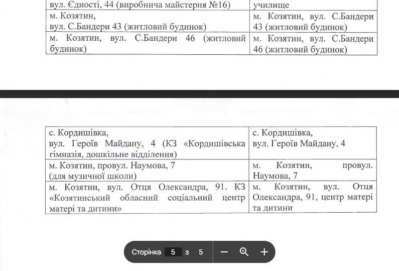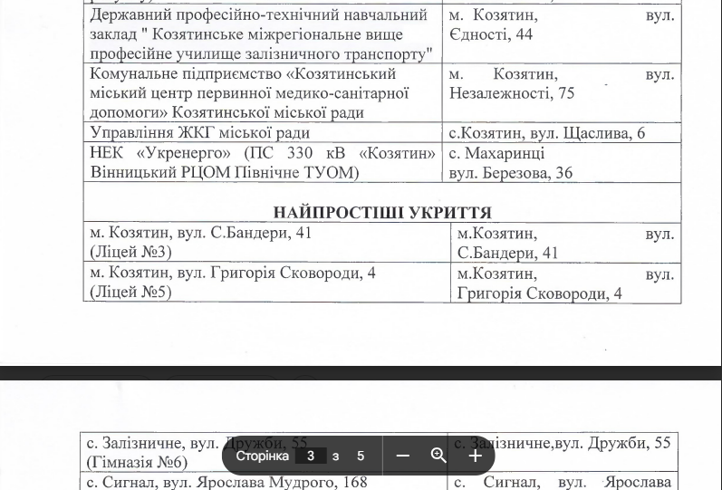Також в запиті на інформацію ми попросили надати перелік укриттів з адресами, що розташовані на території міста Козятин і до яких є цілодобовий доступ у цивільного населення.