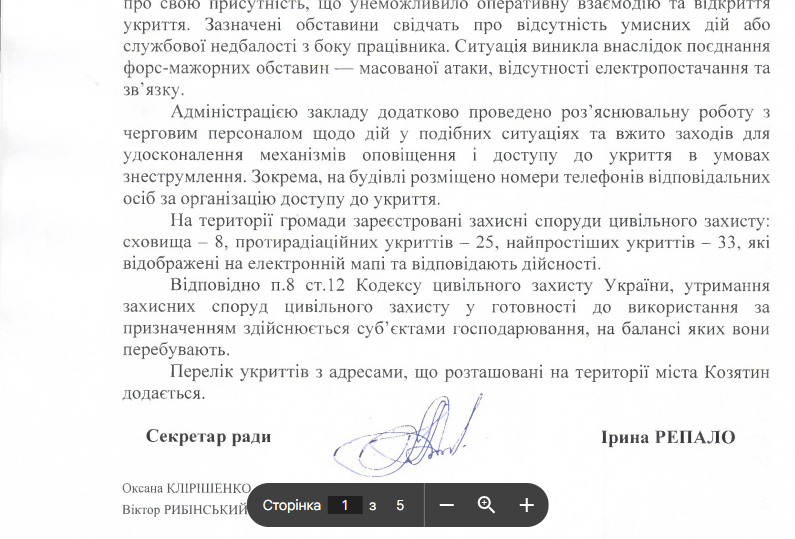Разом з тим встановлено, що особи, які прибули до закладу з метою укриття, не здійснювали активних дій для повідомлення чергового працівника про свою присутність, що унеможливило оперативну взаємодію та відкриття укриття. Зазначені обставини свідчать про відсутність умисних дій або службової недбалості з боку працівника. Ситуація виникла внаслідок поєднання форс-мажорних обставин — масованої атаки, відсутності електропостачання та зв’язку», — йдеться у відповіді на інформаційний запит журналістів.