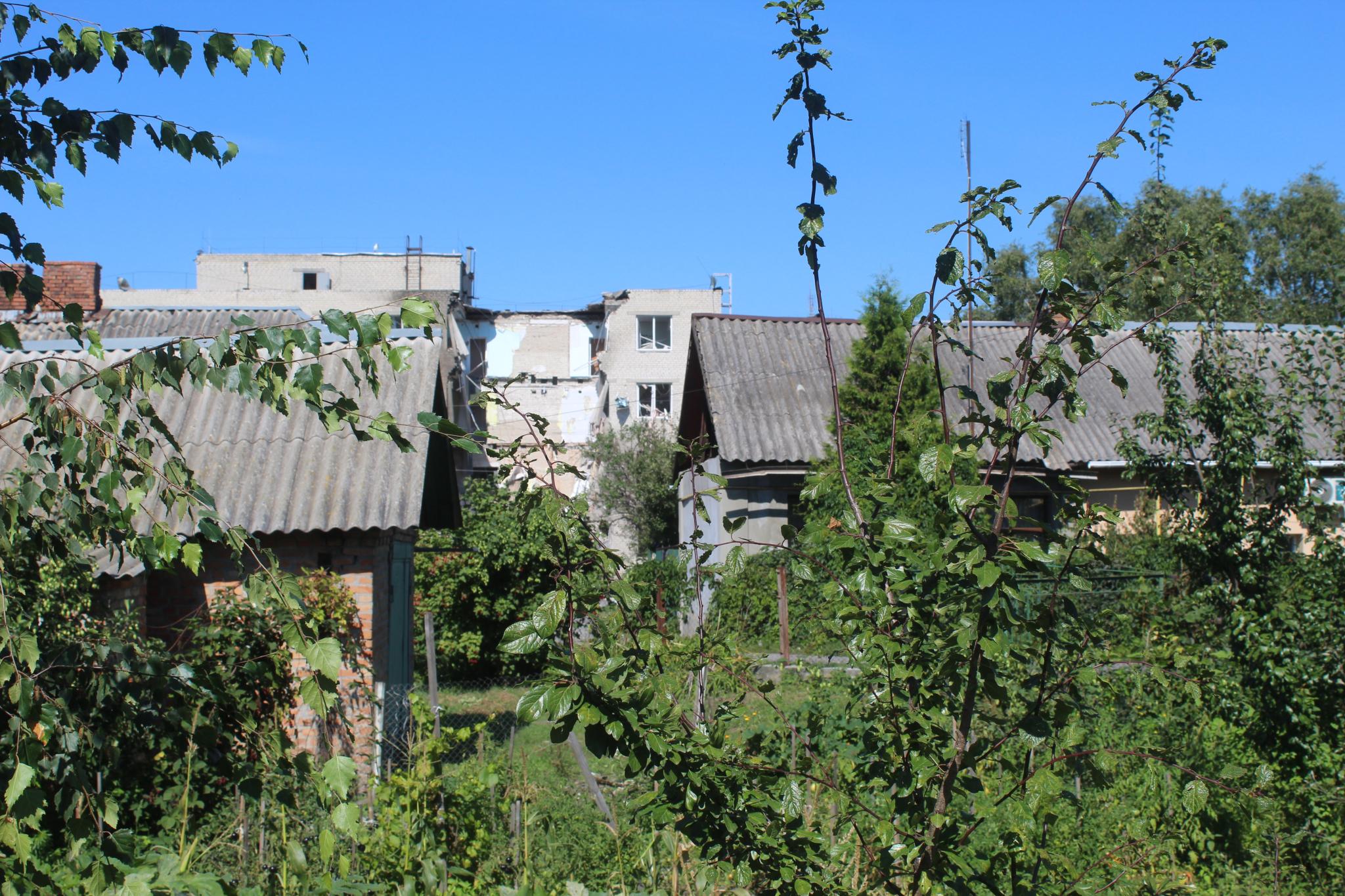 Тільки розвиднілось, ми вийшли на роботу. Ближче до об’єкта, який найбільше постраждав від ураження дронами, дорога всипана склом, битим шифером, зламаними гілками дерев. В одному з багатоповерхових приміщень залишилася тільки стіна тильної сторони.