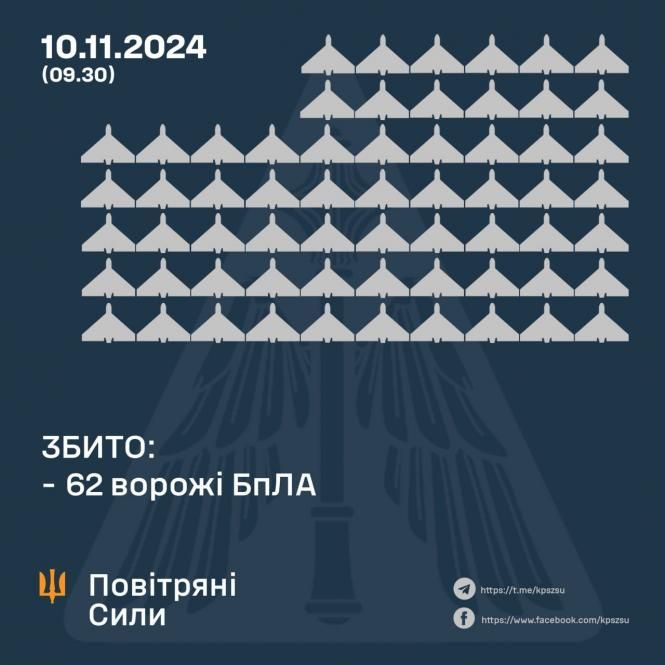 Станом на ранок підтверджено збиття 62-х БпЛА противника у Одеській, Київській, Житомирській, Харківській, Полтавській, Сумській, Вінницькій, Хмельницькій, Чернігівській, Дніпропетровській, Миколаївській, Запорізькій та Донецькій областях.