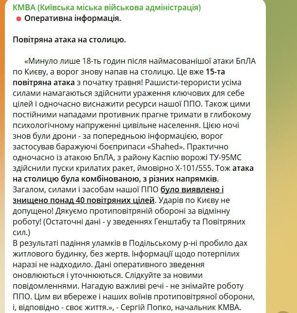 Повідомляють — атака на столицю була комбінованою, з різних напрямків. Одночасно із атакою БпЛА, з району Каспію ворожі ТУ-95МС здійснили пуски крилатих ракет, ймовірно Х-101/555.