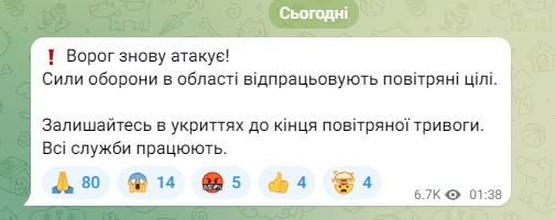 «Сили оборони в області відпрацьовують повітряні цілі. Залишайтесь в укриттях до кінця повітряної тривоги. Всі служби працюють», — йшлося у повідомленні.