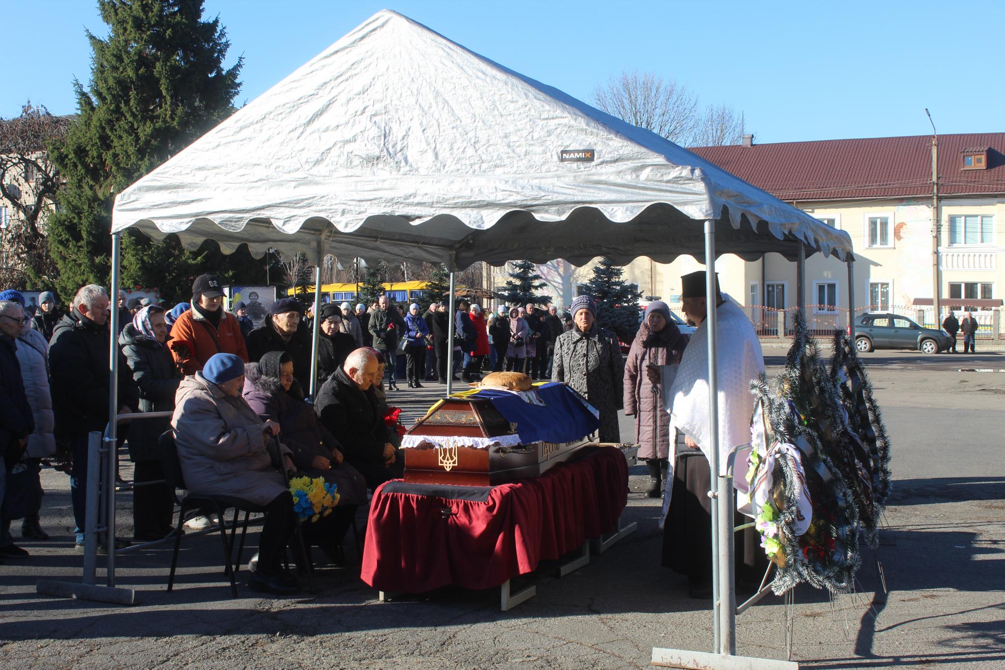 З церкви процесія рушила до центральної площі нашого міста. Там зі славним захисником України прощалася громада. Відкрила мітинг жалоби та пам’яті директор будинку культури Лариса Ромасько. Вона у своєму вступному слові згадала про останні новини на політичному фронті і як не легко нашим воїнам боронити Україну коли ті, хто мав будувати Збройні Сили, шукали свою вигоду. Окремо зупинилася на біографії Героя.