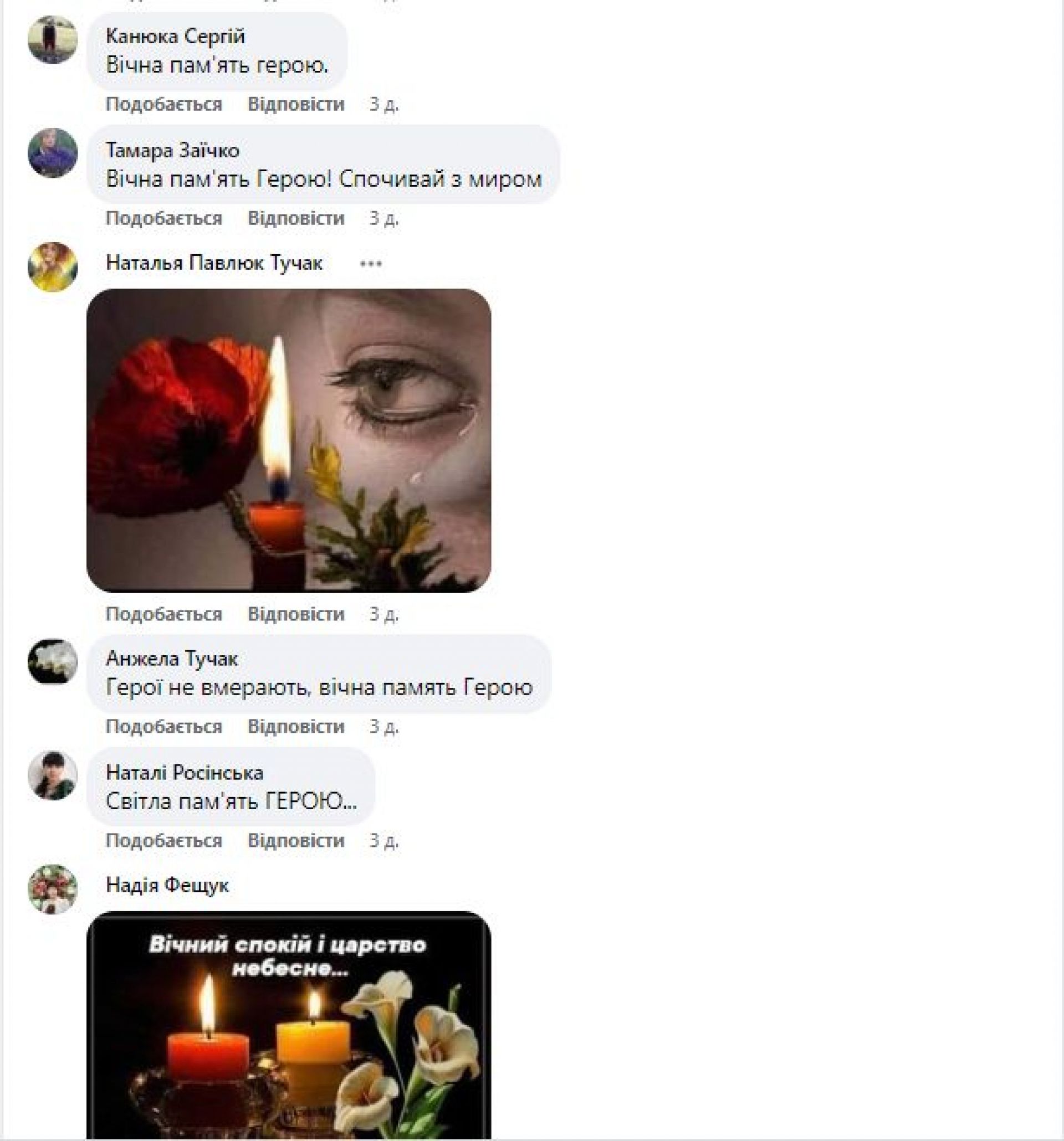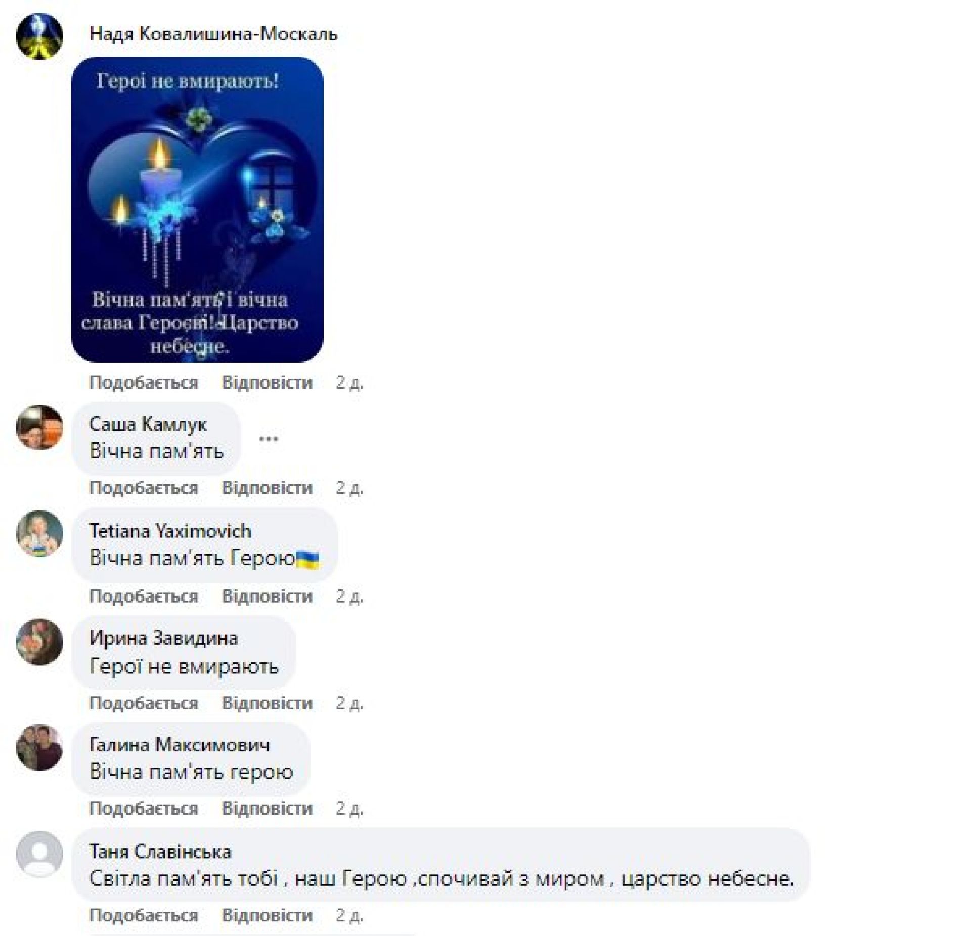 «Я рідна сестра найкращого брата в світі. Маючи на руках квиток за кордон, він пішов до військкомату і записався добровольцем. Він мріяв після закінчення війни обов'язково відвезти батьків на відпочинок до Єгипту, але доля не дала цього зробити. Ми всі пишиємось тобою, Наш Герой. В мирному житті він був доброю та щирою людиною, найкращим сином для батьків, найкращим братом для нас, і турботливим та люблячим батьком для своєї доньки» – розповіла Меморіалу героїв сестра Катерина.