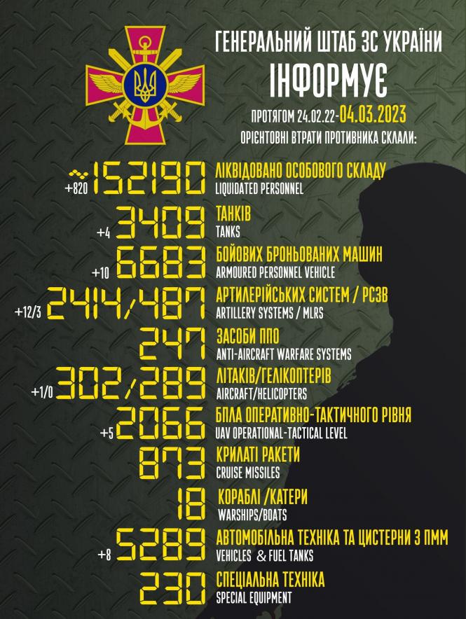 Загальні бойові втрати противника з 24.02.22 по 05.03.23 орієнтовно склали: