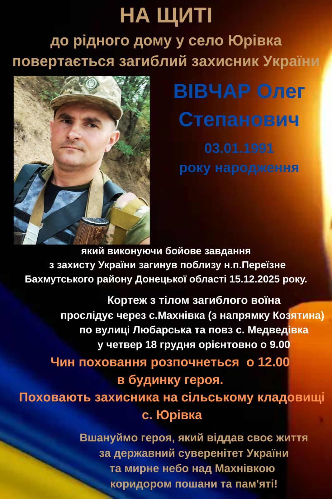 - Чин поховання розпочнеться о 12:00 18 грудня в будинку Воїна у селі Юрівка