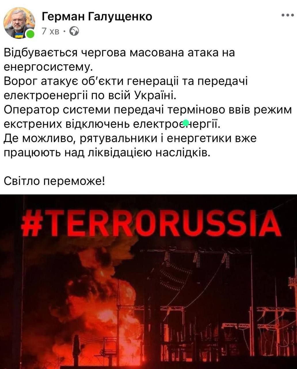 — Масований удар по енергосистемі: рф атакує об’єкти генераціі та передачі електроенергіі по всій Україні, — написав Міністр енергетики України Герман Галущенко