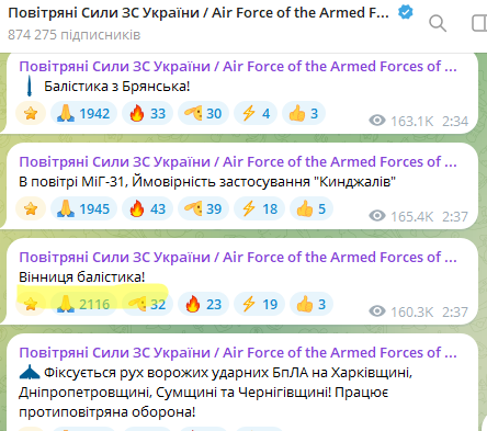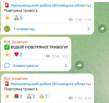 Повітряна тривога на Вінниччині, зокрема у нашому районі лунала двічі — вночі та вранці. Повітряні Сили повідомляли про загрозу балістики у Вінниці.