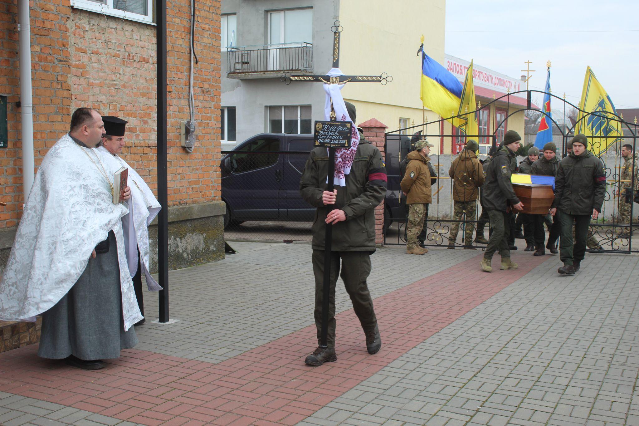 Зі словами вдячності до бабусі й дідуся Богдана звернулися побратими Героя. Вони їм передали прапор та шеврон військової частини, де служив їх онук. Поховали воїна-Героя на Алеї Слави міського кладовища під Гімн України та військовий салют від салютної групи.