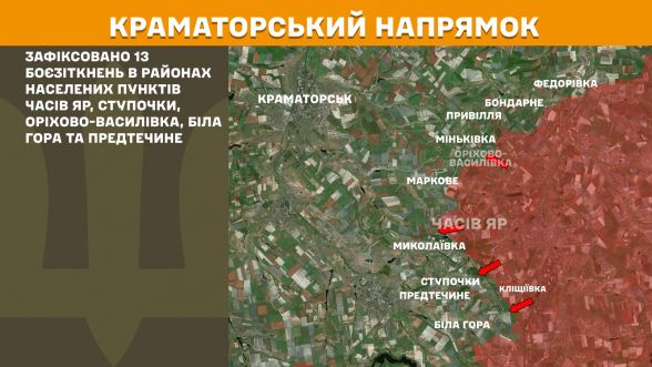 - Краматорський напрямок: 13 боєзіткнень у районах Часового Яру, Ступочок, Оріхово-Василівки, Білої Гори та Предтечиного.