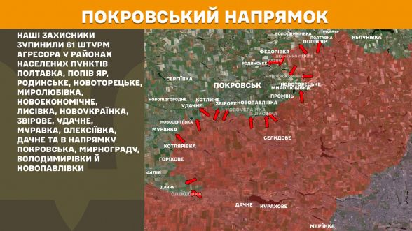 - Покровський напрямок: Наші захисники зупинили 61 штурм агресора у районах Полтавки, Попів Яру, Родинського, Новоторецького, Миролюбівки, Новоекономічного, Лисівки, Новоукраїнки, Звірового, Удачного, Муравки, Олексіївки, Дачного та в напрямку Покровська, Мирнограду, Володимирівки й Новопавлівки.