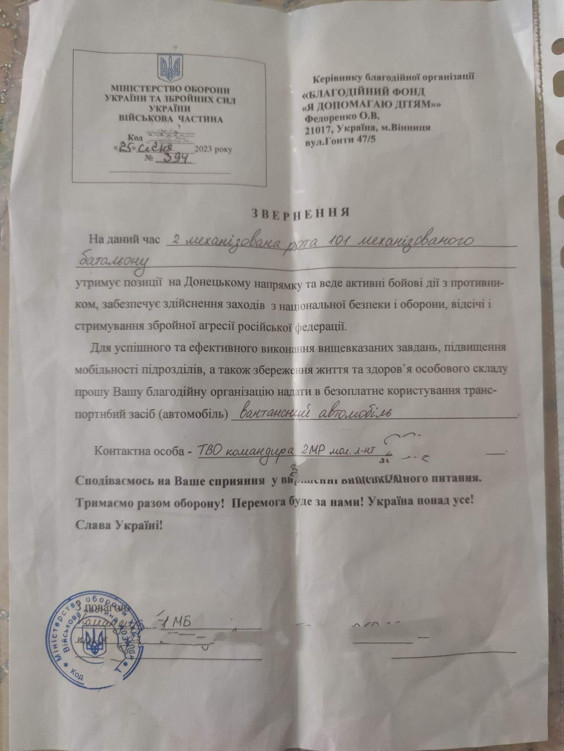 Катерина додає, що важливі кожні 20-30-50 гривень. Акт передачі закупленого автомобіля у другий батальйон 61 бригади нададуть після завершення збору.