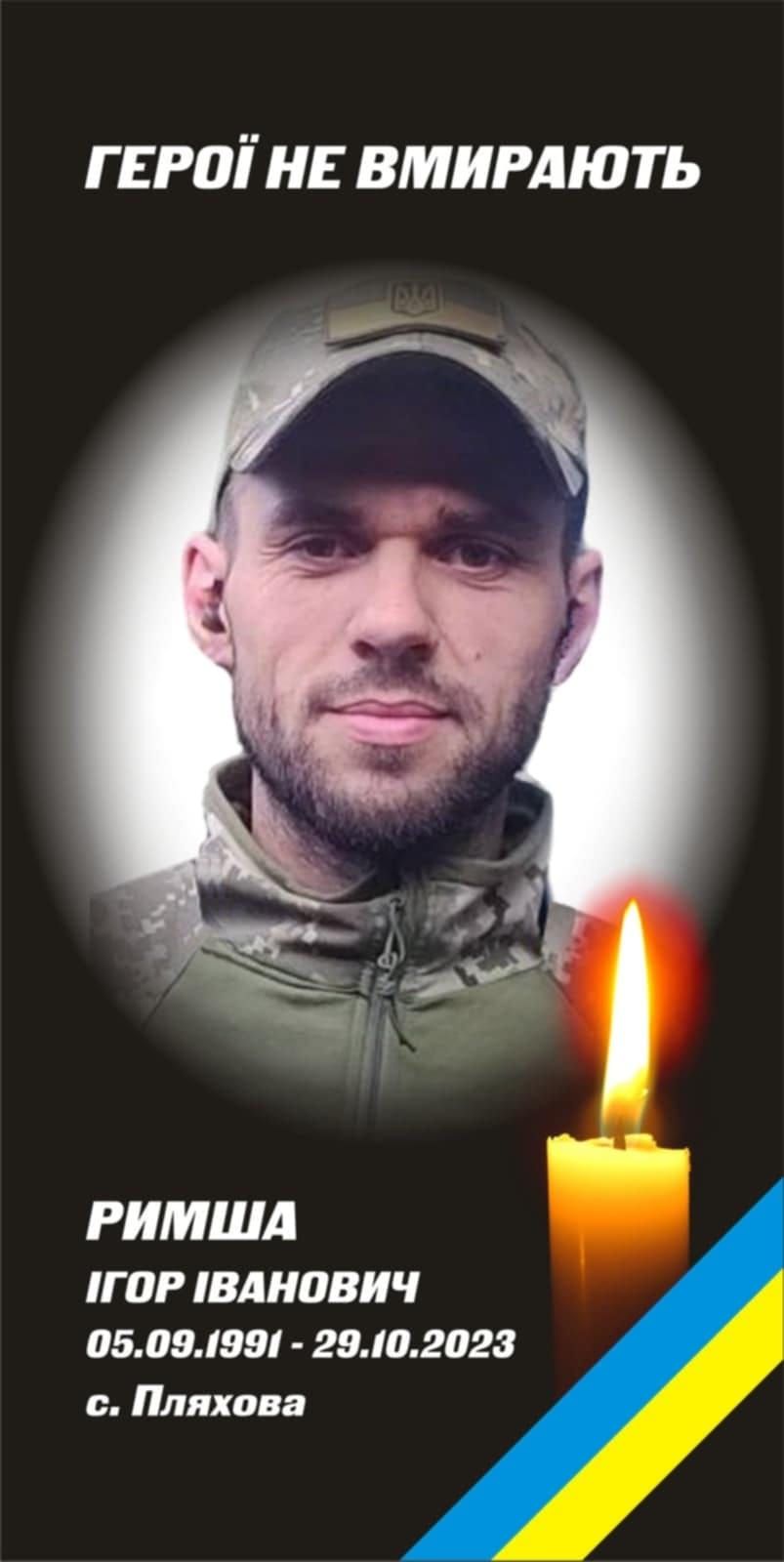 29 жовтня 2023 року мужньо виконавши військовий обов’язок, в бою за Україну, її свободу і незалежність, поблизу населеного пункту Кліщіївка Бахмутського району, Донецької області, героїчно загинув нескорений Син України, житель села Пляхова — Солдат Ігор Римша. Йому навіки залишилось 32…