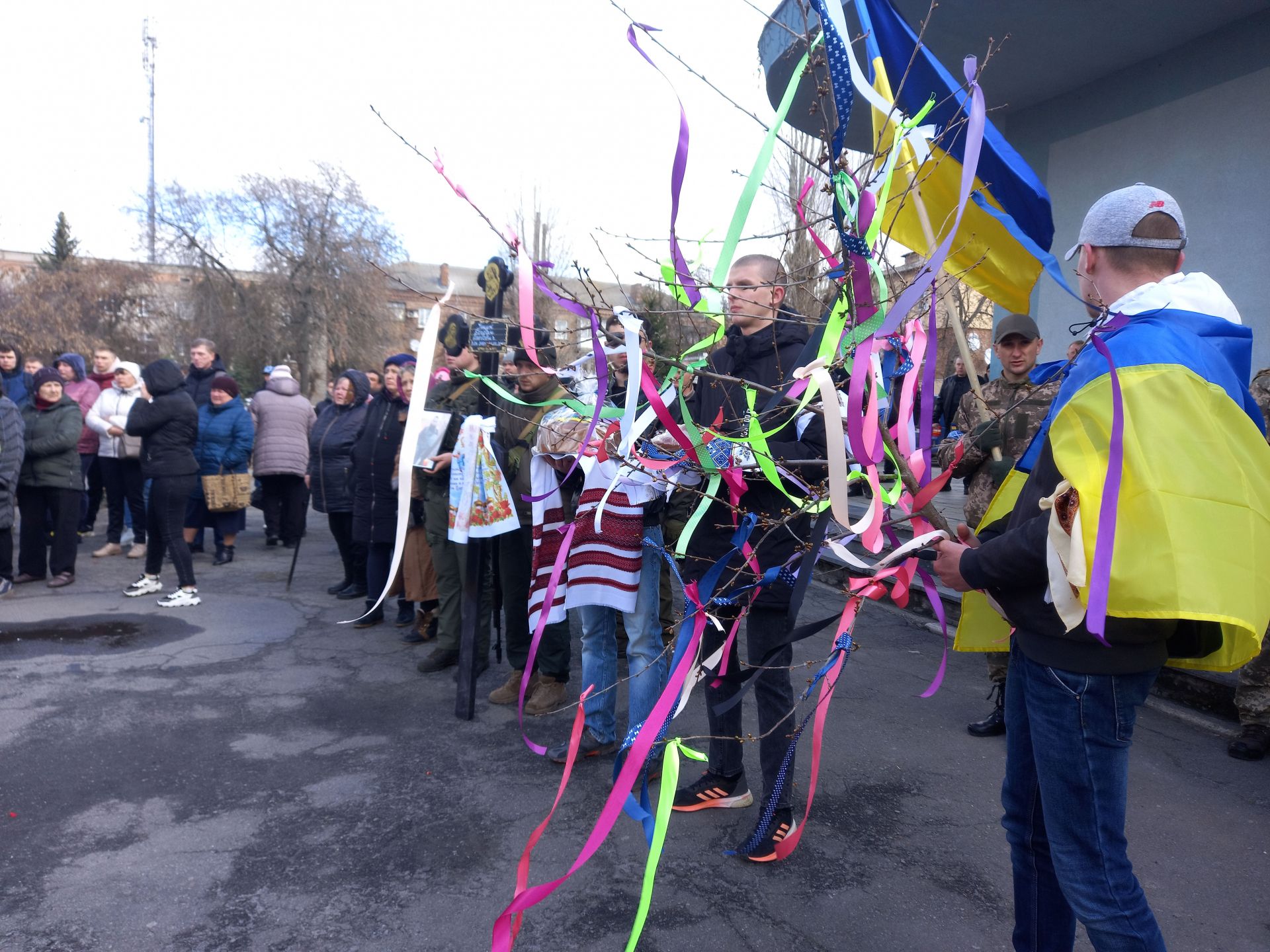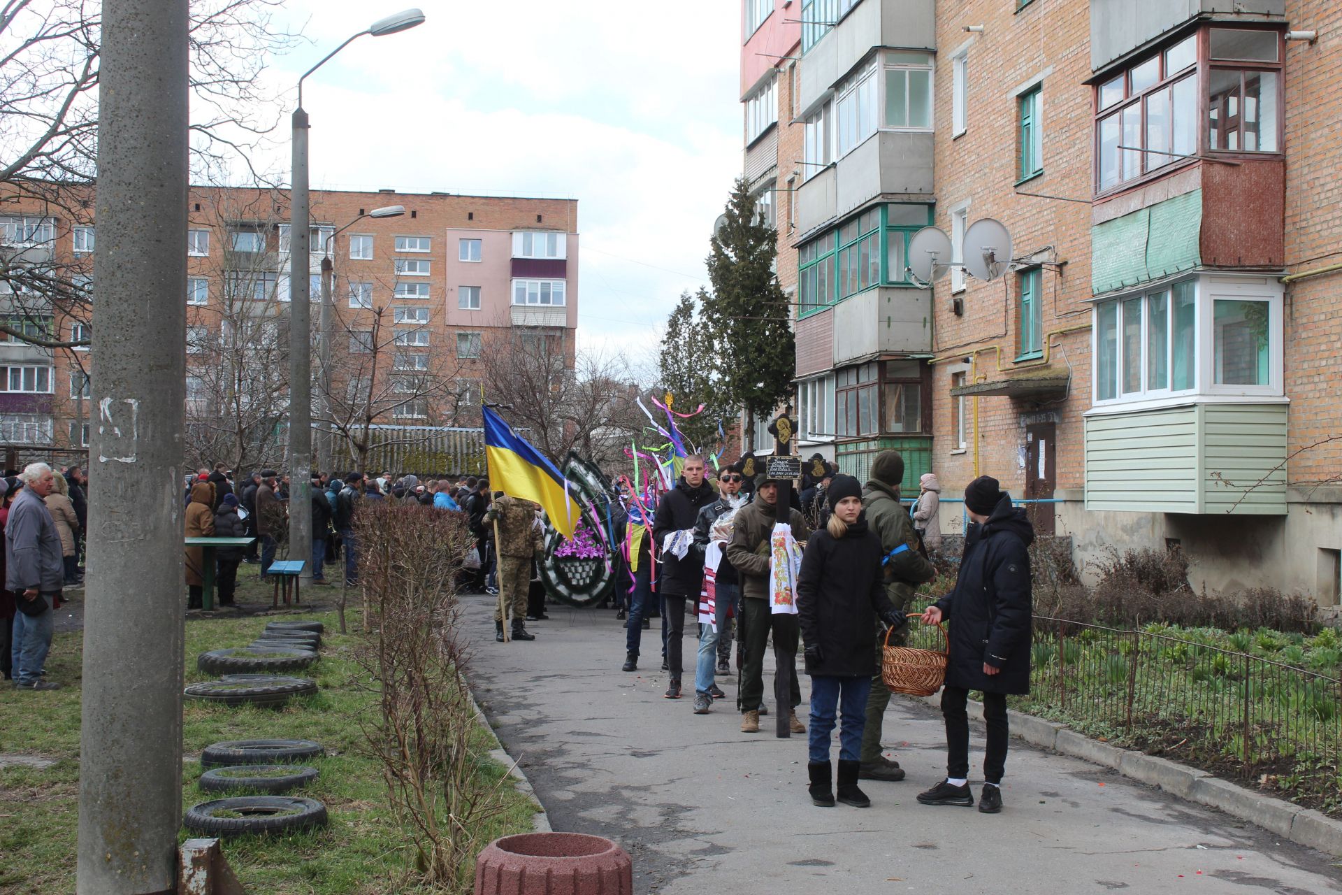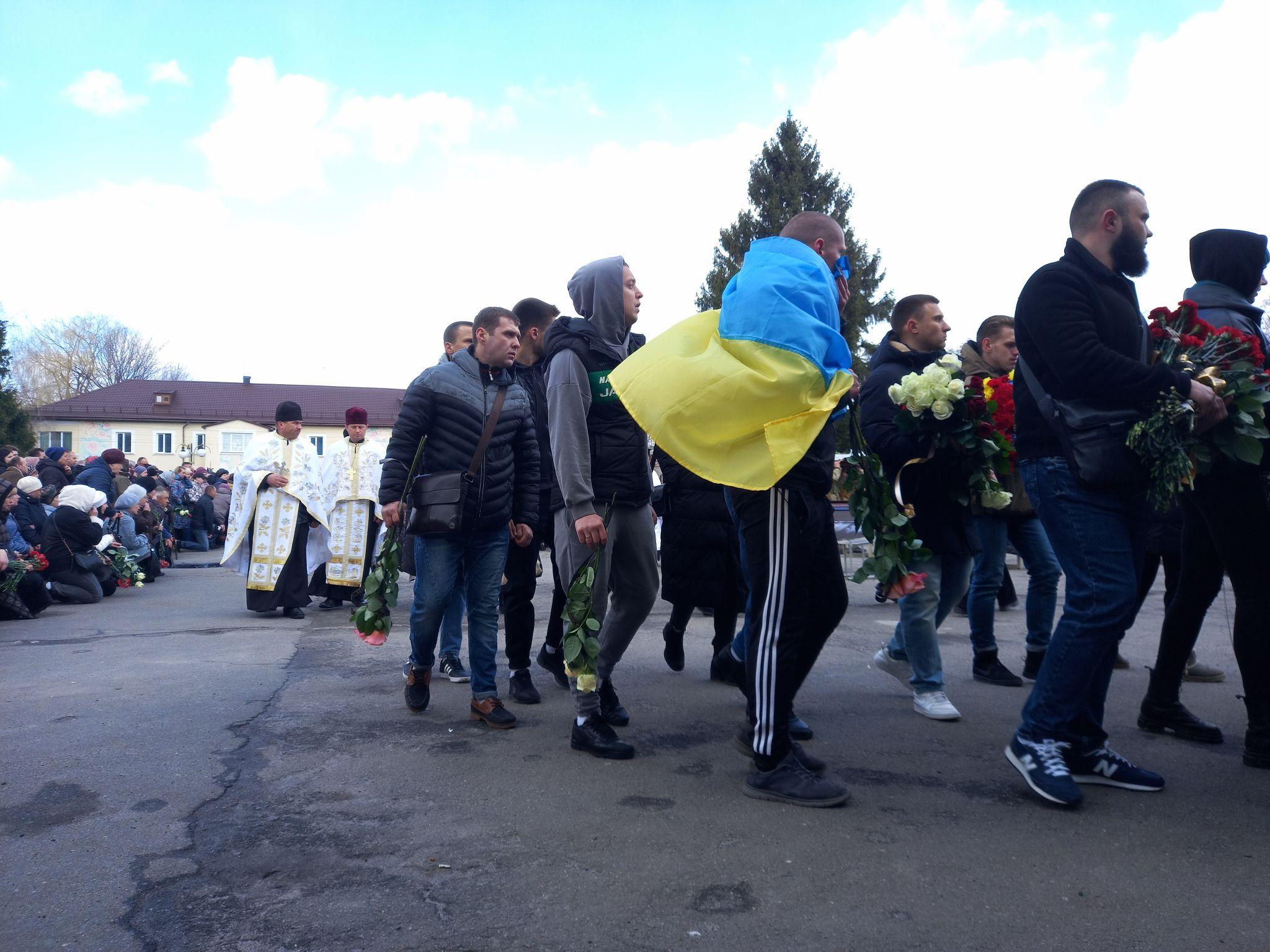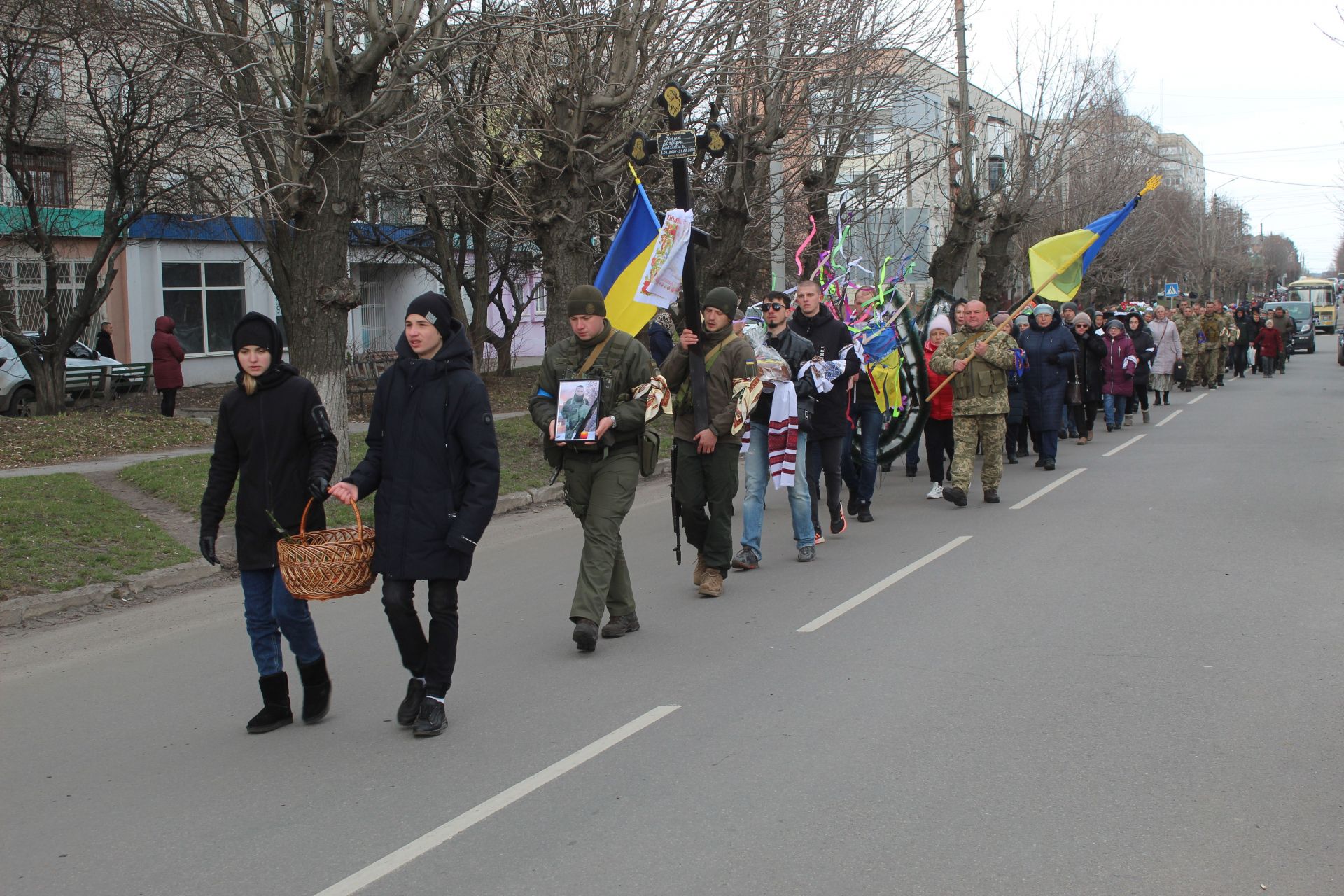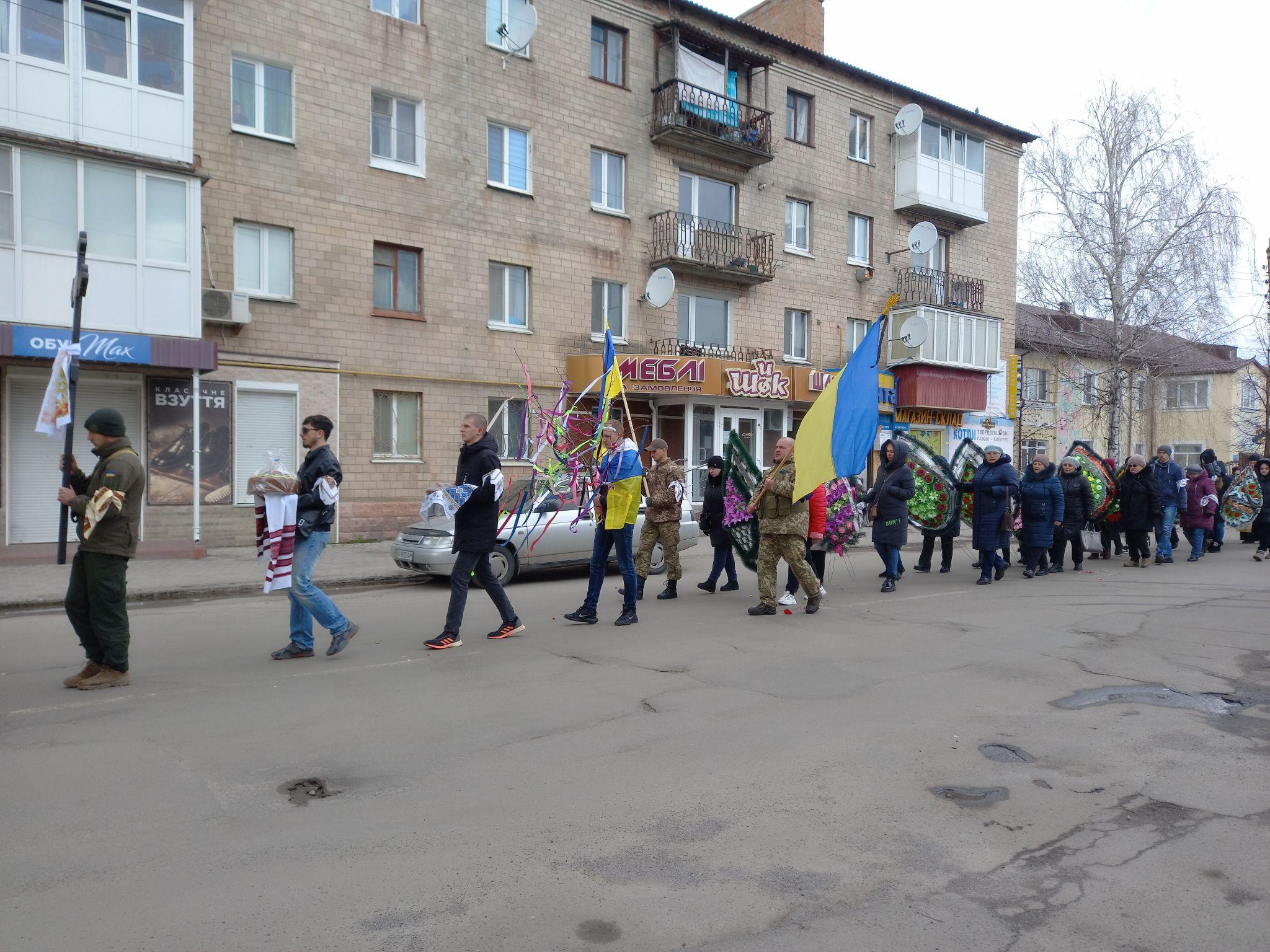 Попереду траурної процесії йшлши молоді люди, які розкидали пелюстки квітів. Несли не лише жовто-блакитні Прапори, а й гілочку, прикрашену різнобарвними стрічками, адже наш Герой не був навіть одружений. Козятинчани стали на коліна, аби віддати шану молодому захиснику.