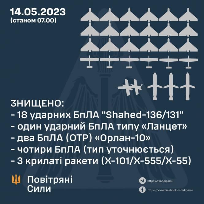 Як інформують Повітряні сили, у ніч на 14 травня 2023 року російські окупанти атакували Україну з різних напрямків ударними дронами «Shahed-136/131», ракетами «Калібр» з кораблів у Чорному морі, крилатими ракетами Х-101/Х-555/Х-55 з літаків стратегічної авіації Ту-95мс.