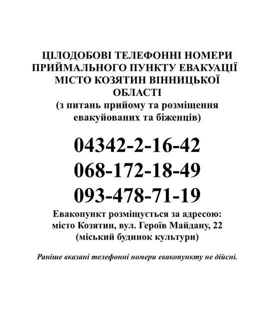 Оновили цілодобові телефонні номери приймального пункту евакуації у Козятині
