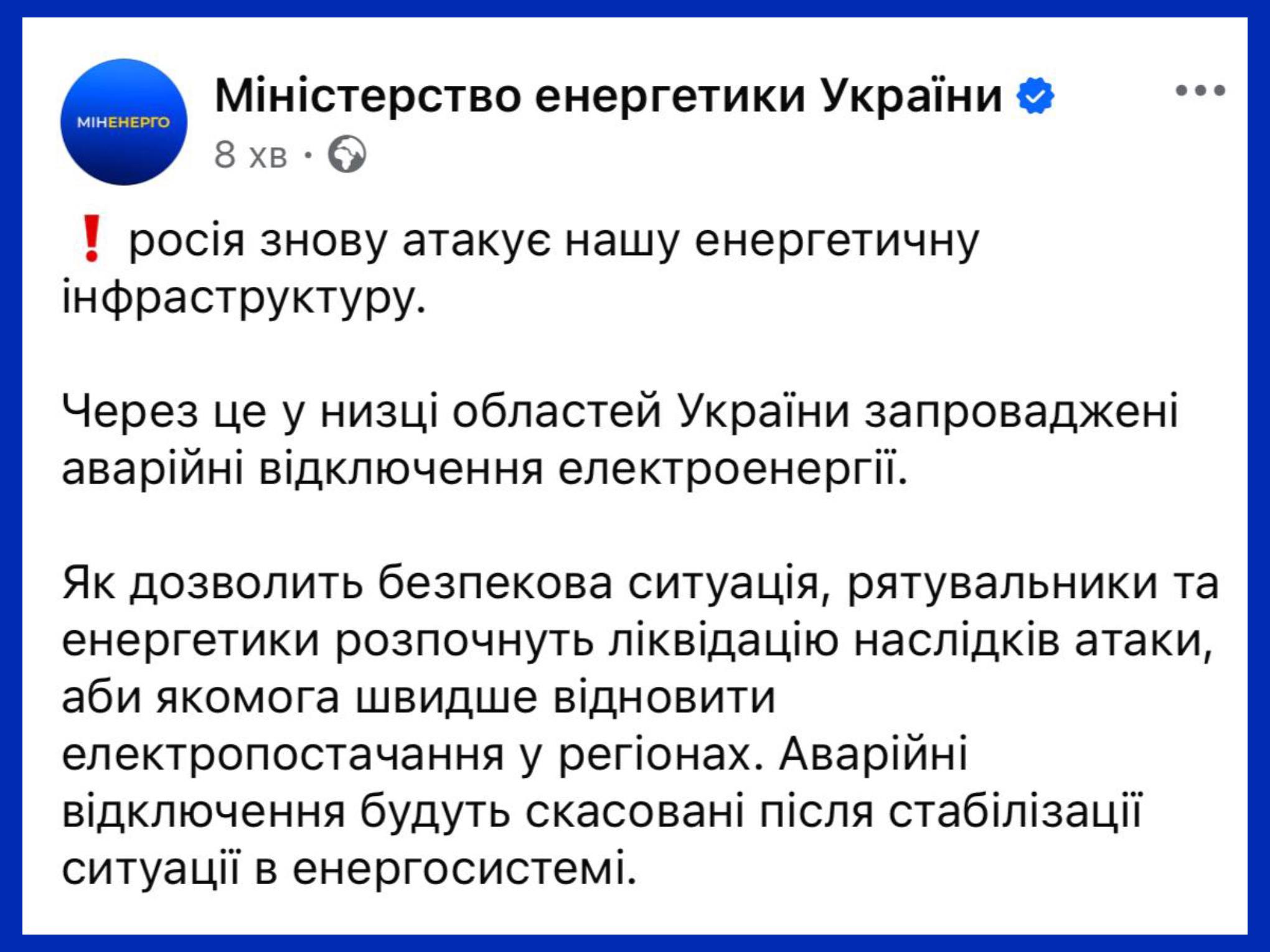 — Відновлювальні роботи розпочнуться, як тільки дозволить безпекова ситуація. Аварійні відключення будуть скасовані після стабілізації ситуації в енергосистемі, — повідомляє Укренерго