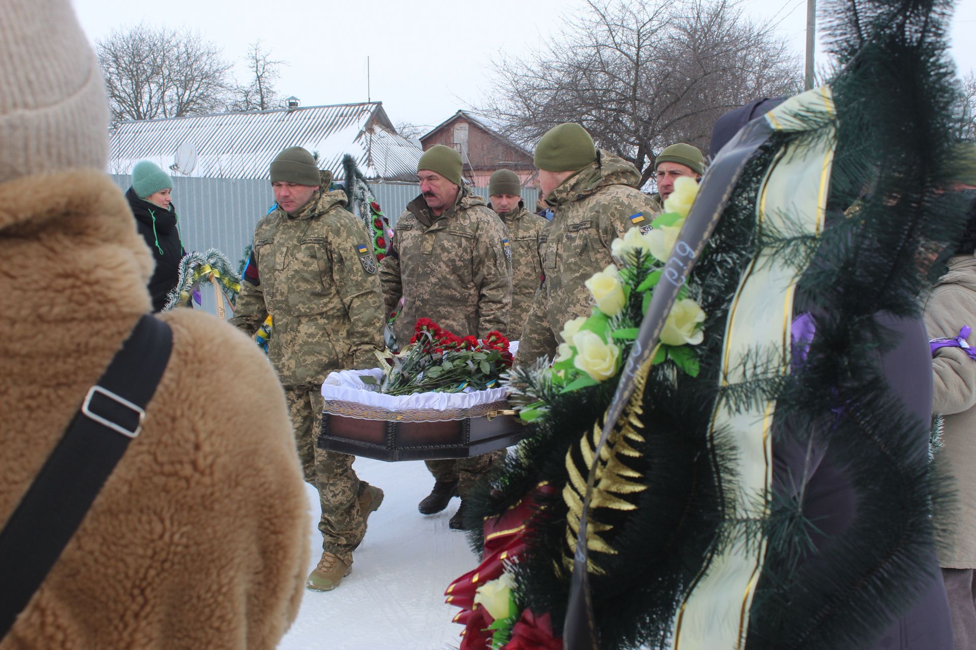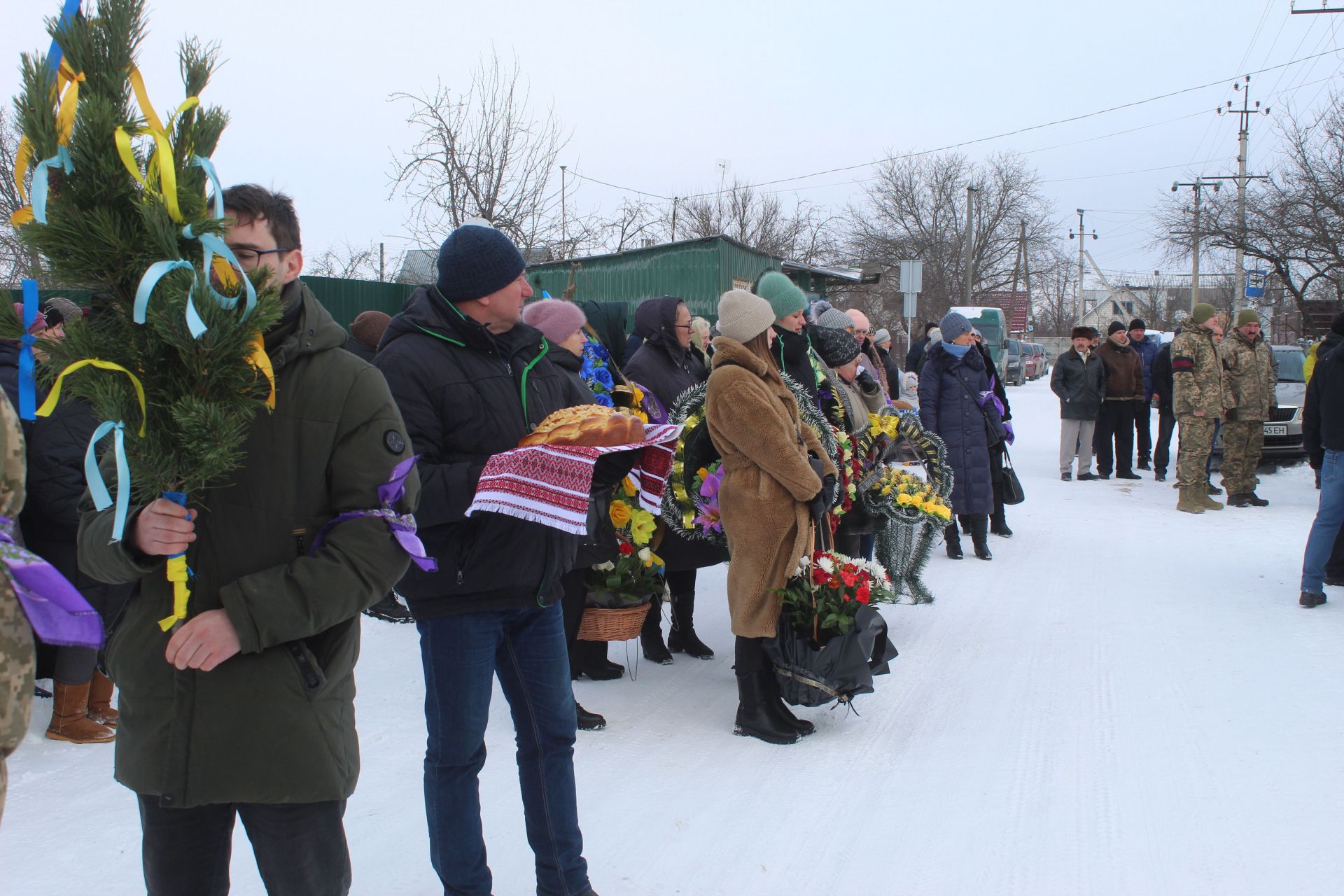 Після заупокійної молитви стала вистроюватися траурна колона. В її голові однокласник Сергія Іван тримав вбрану кольоровими стрічками гілку сосни, що означало, що загиблий воїн ще був не одруженим. Далі коровай, прапор України, портрет воїна корзини з живими квітами.