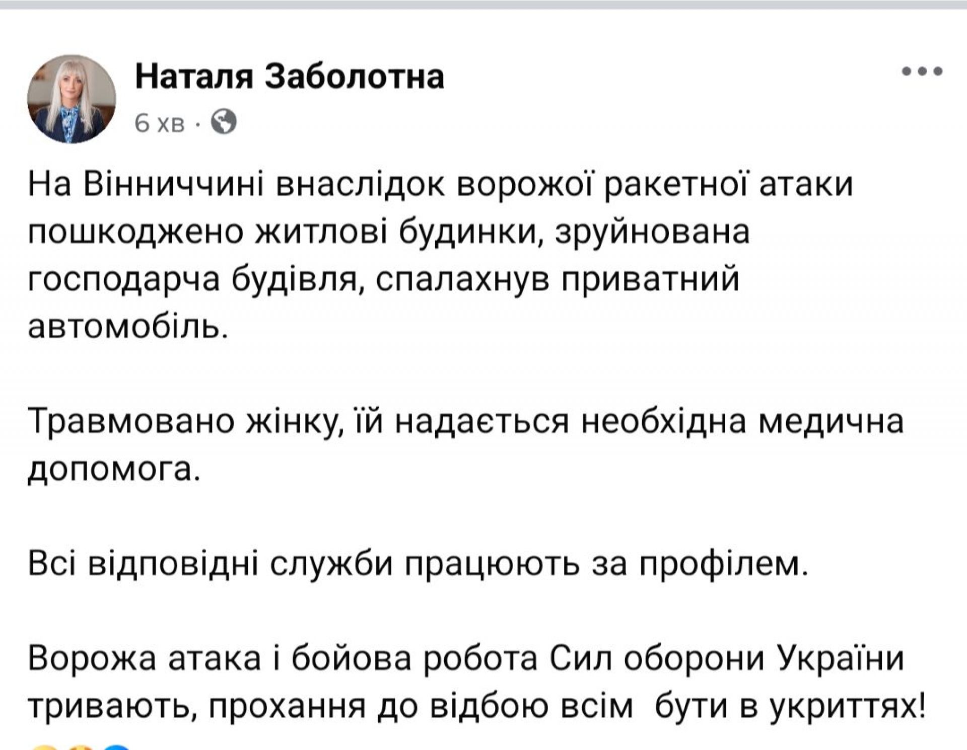 — На Вінниччині внаслідок ворожої ракетної атаки пошкоджено житлові будинки, зруйнована господарча будівля, спалахнув приватний автомобіль, —написала у себе на Фб сторінці Наталя Заболотна, перша заступниця голови Вінницької ОВА