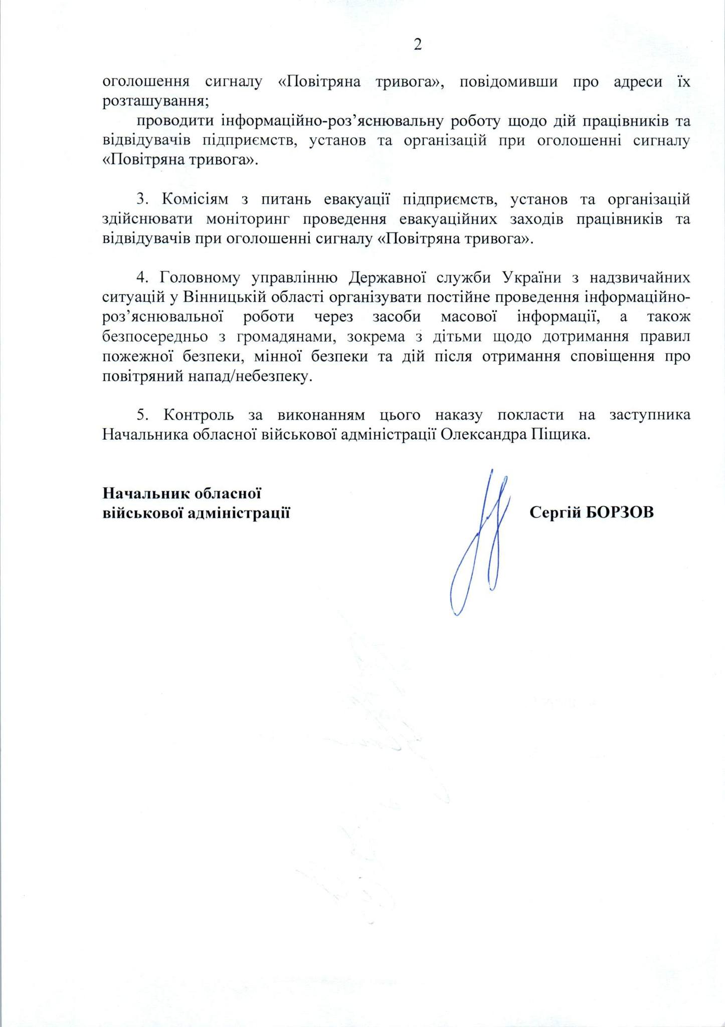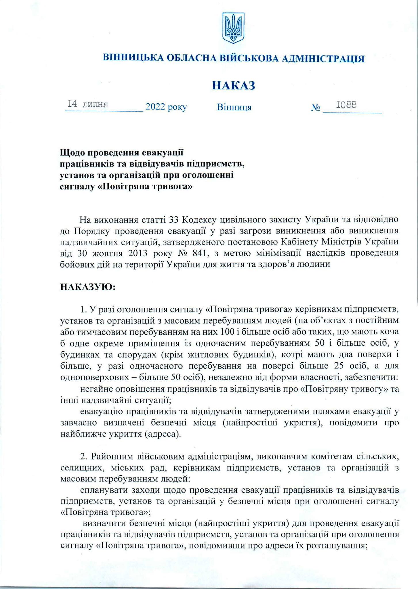 Начальник обласної військової адміністрації Сергій Борзов підписав Наказ №1088 від 14 липня 2022 року «Щодо проведення евакуації працівників та відвідувачів підприємств, установ та організацій при оголошенні сигналу «Повітряна тривога».
