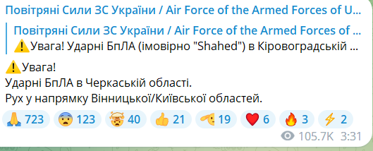 За повідомленням Повітряних Сил ЗСУ «Шахедами» противник атакував із півдня (мис Чауда, Крим), спрямував їх у різних напрямках — південні, східні та центральні регіони України, по маршруту слідування ударних БплА працювала протиповітряна оборона.