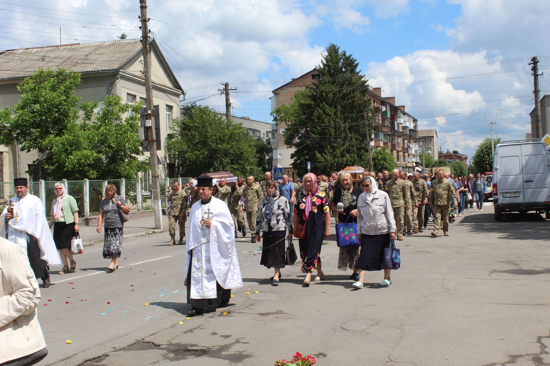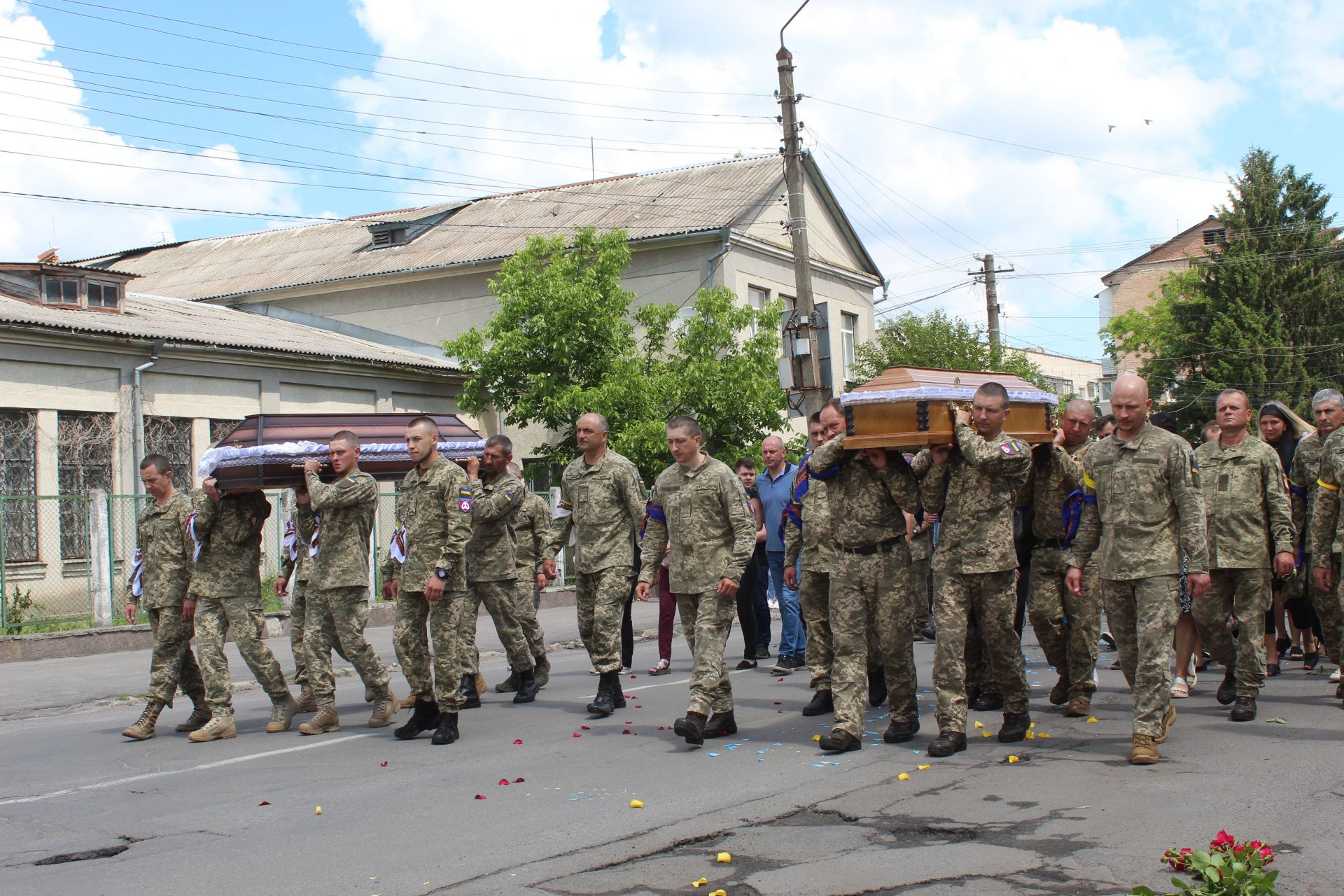 На розі вулиць Стуса та Пилипа Орлика до процесії провулку Лікарняного приєдналася траурна колона ще одного Героя Василя Пирогова. Так двома колонами очолюваними жінками, які стелили дорогу воїнам Героям живими квітами, траурна процесія дійшла до площі.