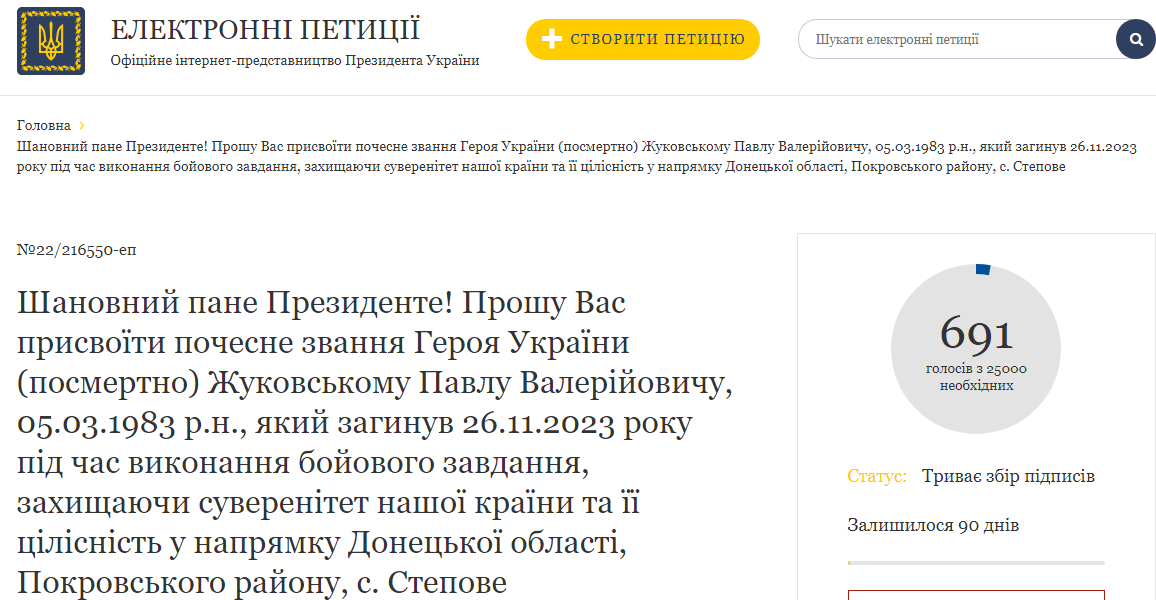 - На офіційному інтернет-представництві Президента України 23 січня опублікували електронну петицію з проханням присвоїти звання Героя України (посмертно) військовослужбовцю Павлу Жуковському, який загинув 26 листопада 2023 року під час виконання бойового завдання, захищаючи суверенітет нашої країни та її цілісність у напрямку Донецької області, Покровського району, с. Степове