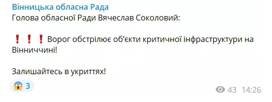 - За повідомленням Сергія Борзова Вінницька область опинилася під обстрілом ворога — є влучання в об’єкти критичної інфраструктури