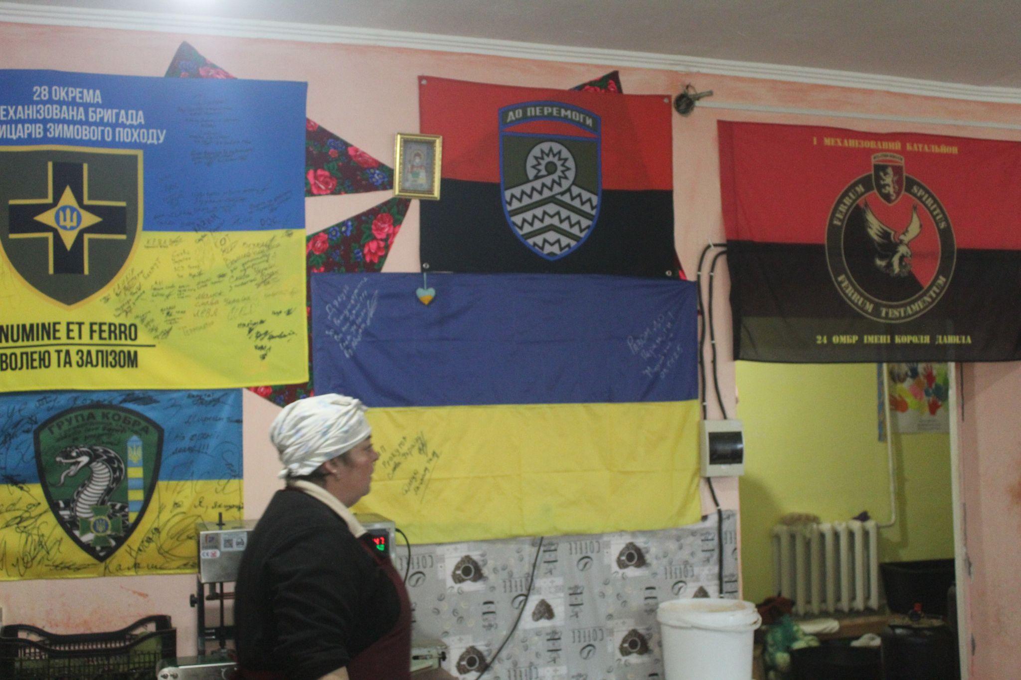 Ольга завершила роботу з автоклавом і про волонтерську роботу вже говорили з нею. Вразило, що весь цех переробки обвішаний прапорами бригад і батальйонів, до яких «Міцний тил» поставляє готову продукцію.