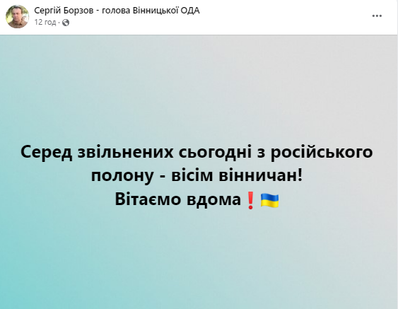 Як написав голова Вінницької ОВА Сергій Борзов — серед звільнених сьогодні з російського полону — вісім вінничан.
