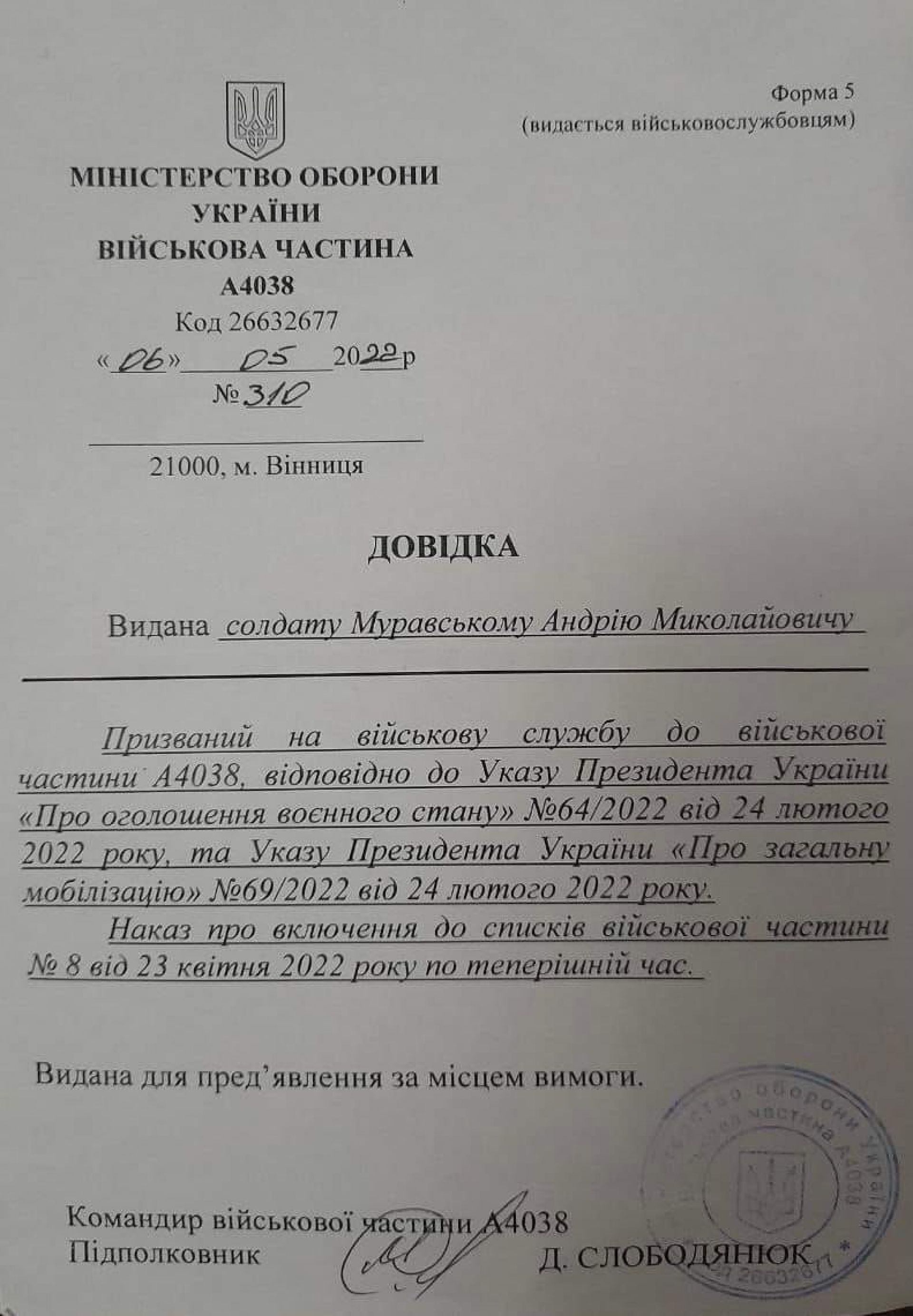 — Допоможіть знайти мого сина Муравського Андрія Миколайовича 24.10.1998 року народження, — звертається Наталія. — Все, що я знаю, то це те, що Андрій служить у військовій частині А 4038, 38 стрілковий особовий батальйон, перша рота, кулеметний взвод, приєднана до бригади 79. У нього позивний «Мураха», і шеврон такий теж є. Останній раз виходив на зв’язок 23 травня. Нічого не розповідав, єдине сказав, що він у гарячій точці. В мене є інформація, що вони потрапили під артилерійських обстріл. Все підірвалося. Серце не на місці. Де моя дитина?