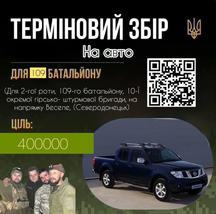 Окрім авто, нашим захисникам також потрібні РЕБ-станції, «Мавіки» та «FPV-дрони». Ціль збору — 400 тисяч гривень.