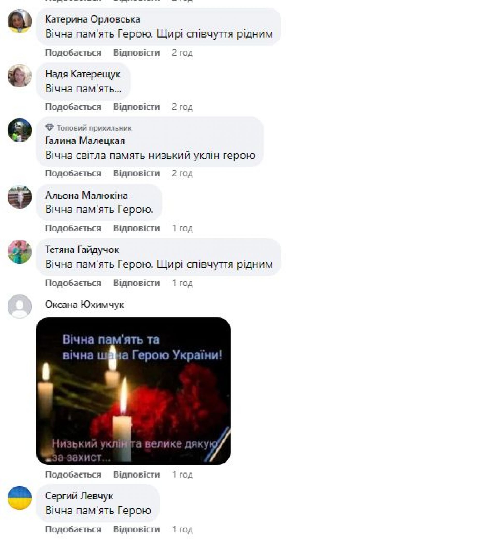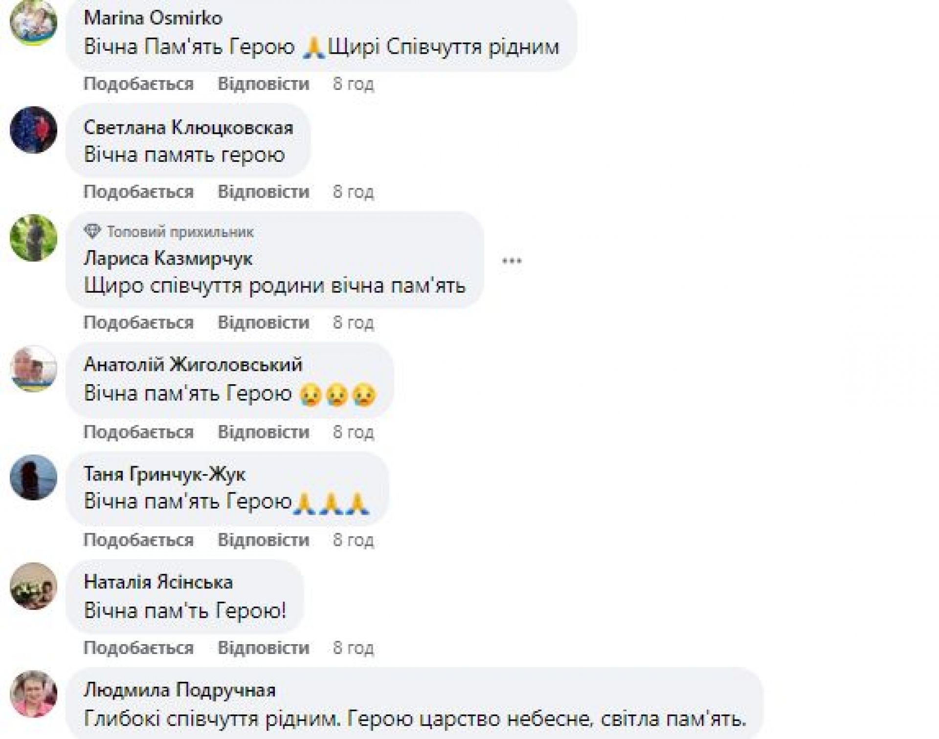 — В такий важкий час, висловлюємо щирі співчуття рідним і близьким Героя та поділяємо горе батьків, родини, друзів. Важко знайти слова які можуть зменшити тугу і смуток, неможливо загоїти біль та гіркоту від втрати такої молодої людини. Сумуємо разом із вами, низько схиляємо голови у скорботі.