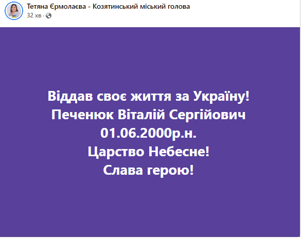Після обіду знову погана новина - наша громада втратила Печенюка Віталія Сергійовича 2000 року народження.
